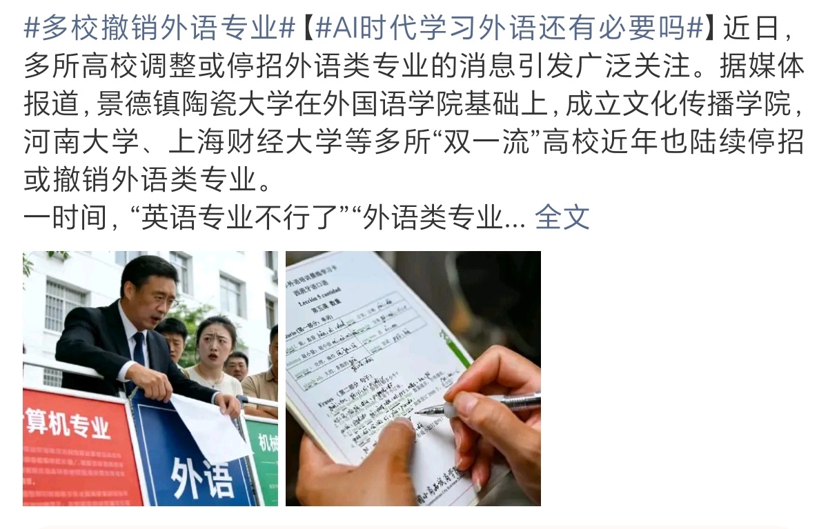 多校撤销外语专业学就要学成尚雯婕那样 作为一项技能几十年都在用让外语成为另一种母语大概是最佳状态不是灵机一动 想着去学吧 拿个证 最后全丢了外语在当下有用只是在科学技术的映衬下显得似乎不那么重要了当你没有科技傍身的时候当你必须依靠自己的能力时它会显得格外重要会外语放在现在的意义约莫就是碰上的时候能提高效率🤔