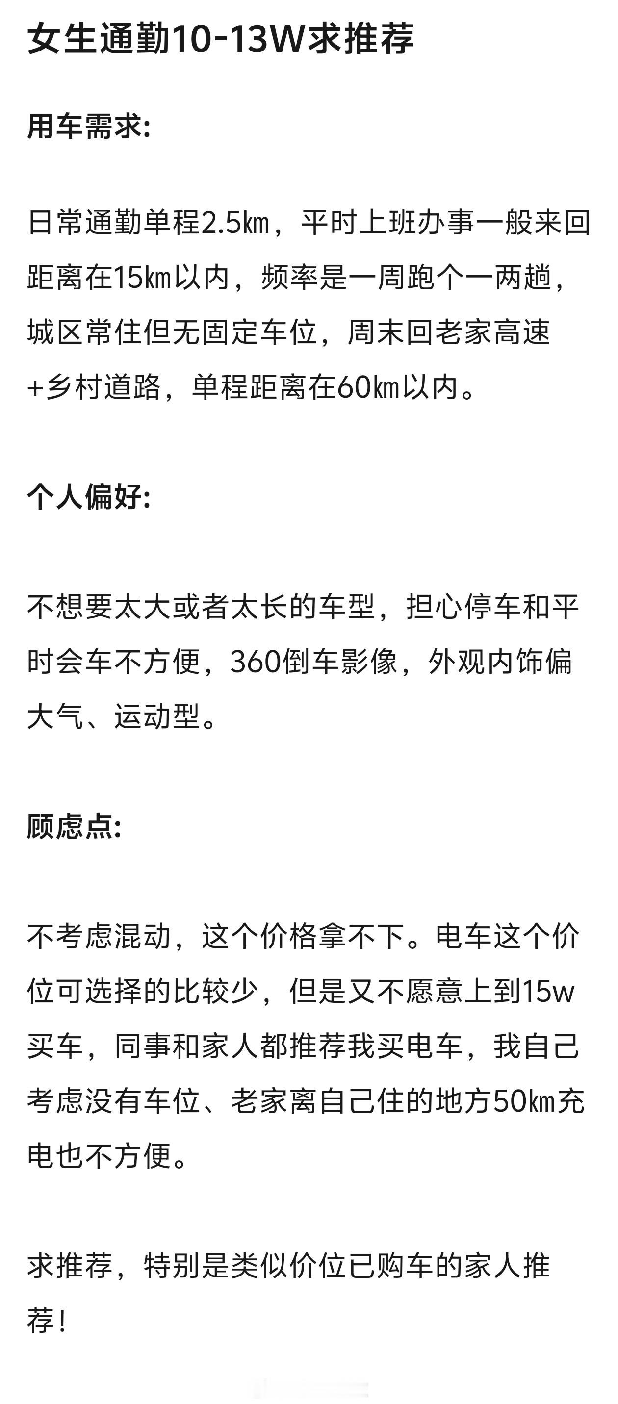 女生通勤10-13W求推荐,第一时间想到的就是小鹏Mona M03。日常通勤单程2.5㎞,平时上班办事一般来回距离在15㎞以内,频率是一周跑个一两趟,城区常住但无固定车位,周末回老家高速+乡村道路,单程距离在60㎞以内。汽车今日出行