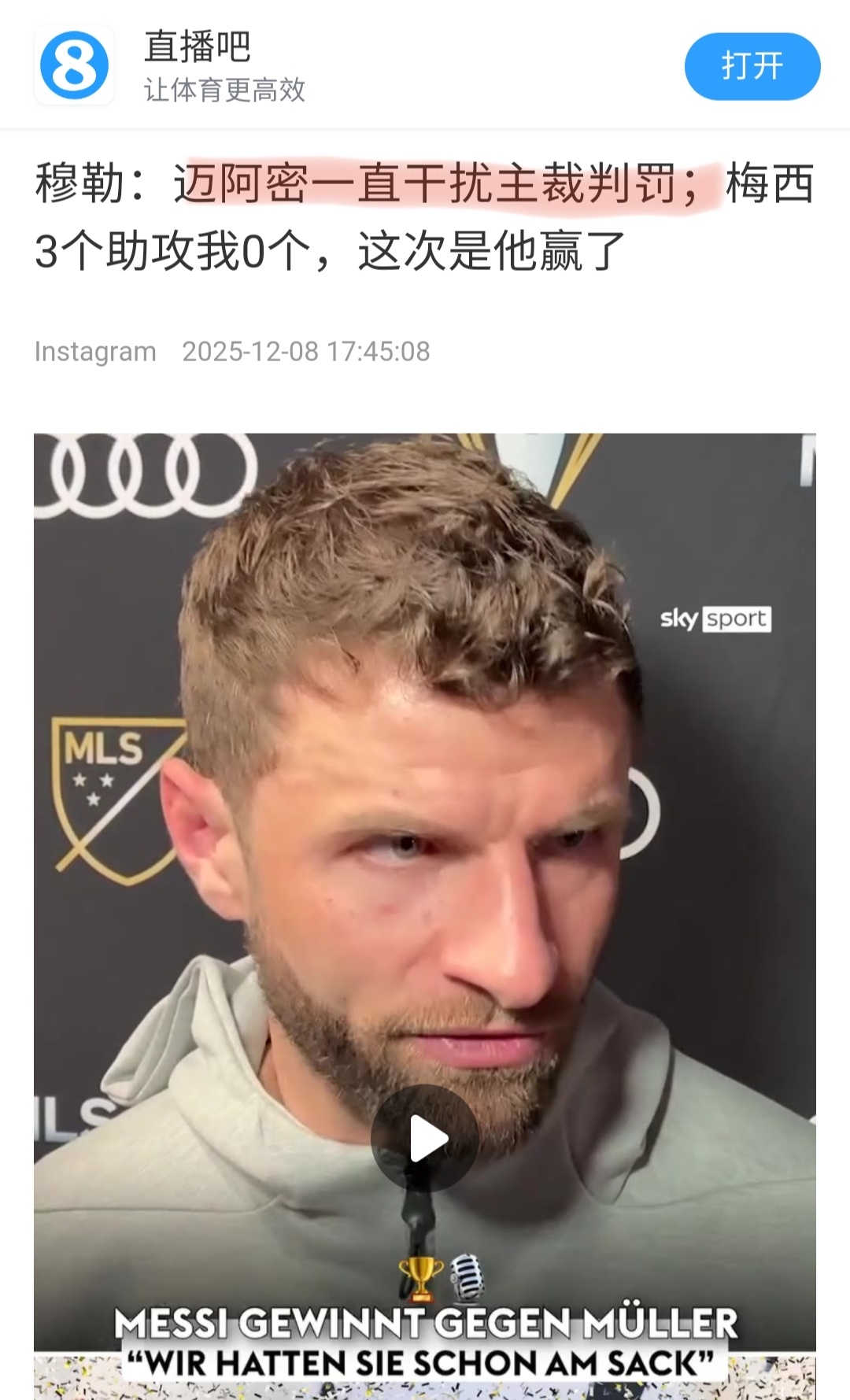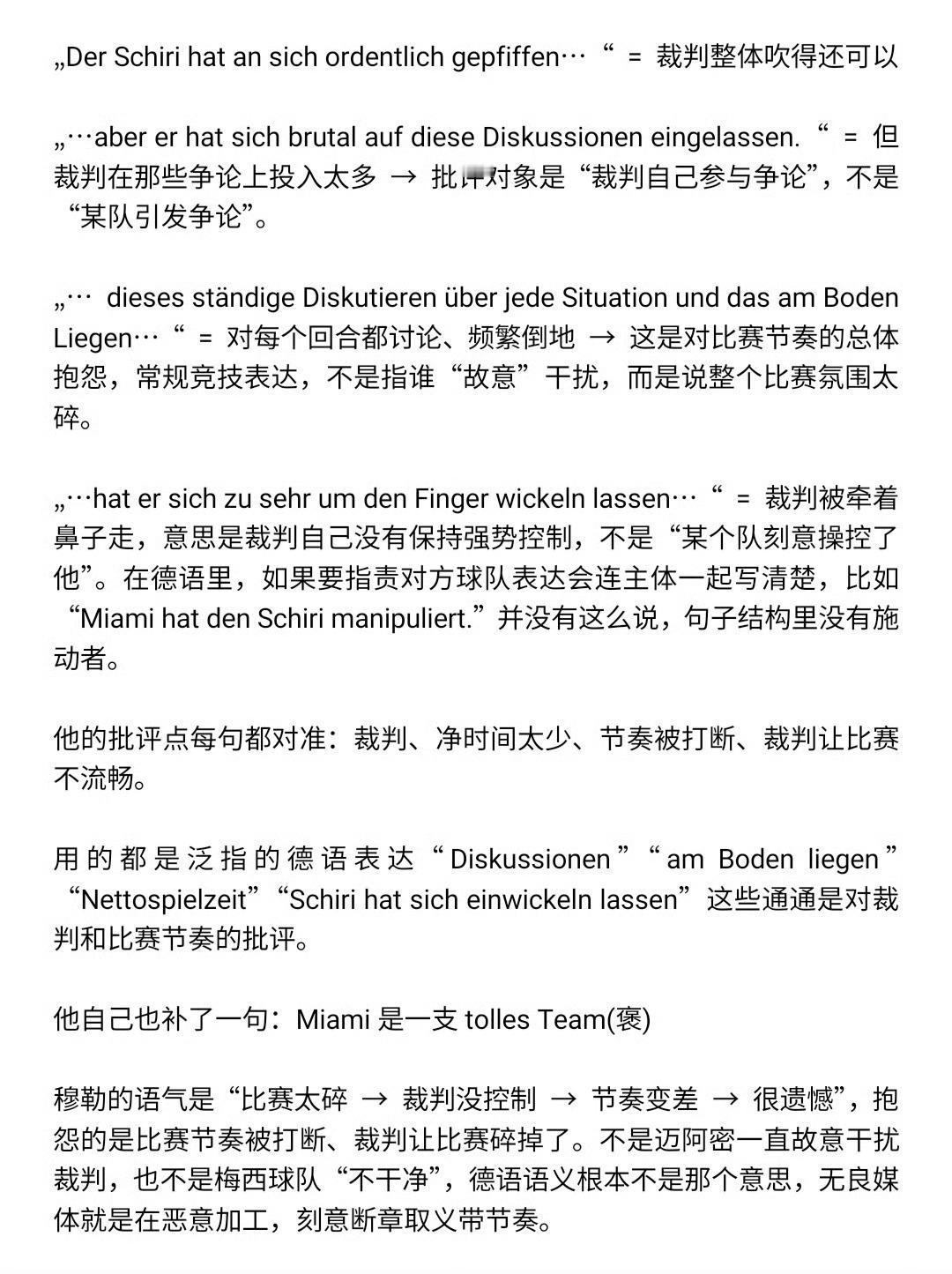 直播吧翻译完满意的不行觉得自己可呆萌了,可会引战了,可会带节奏了 ❌是错的,很标题党的引战招数,故意往穆勒在攻击球队的方向带。ml是在批评裁判,不是在攻击迈阿密。他原话里关键的两句是:“Der Schiri hat … ordentlich gepfiffen … aber er hat sich brutal auf diese Diskussionen eingelassen.”——裁判基本吹得还行,但他被那些争论拖得太厉害了(德语里aber后面的才是表强调重点,这里前面只是先礼后兵的客气)。“… dieses ständige Diskutieren über jede Situation und das am Boden Liegen … da hat er sich zu sehr um den Finger wickeln lassen.”——每一个小争论,每一次倒地动作,他都要花时间讨论,被牵着鼻子走了,净比赛时间少了,这挺遗憾。(对这个裁判的作为形容是 太夸张了&太可惜了)逻辑完全批评的是“裁判把控不住比赛节奏”,不是“迈阿密蓄意干扰”,不是直播吧翻的“迈阿密一直扰乱判罚”、“他们在影响裁判”。只是抱怨比赛净时间太少、节奏被打断、裁判应该更果断。这种表达又不是没见过,不针对对手,而是说比赛节奏被搞得太碎。直播吧直接把这类“比赛被打断→裁判被挑动”加工成:“穆勒炮轰迈阿密干扰判罚”这完全是标题党。愿意应该译为裁判没控住比赛节奏,翻成说迈阿密不干净是不专业的,是翻译问题。德媒skysport没这么解读,转载的sport1没这么解读,转载的英媒解读的是说判罚时引起的争论太多这对比赛很糟糕,我昨晚听的完整版也没有抨击迈阿密 (如果真的有这个内容我肯定都会搬的) ,只有直播吧这么解读了,我也是坠了,不知道传播虚假激化矛盾到底有什么好处但是我来说这个又太怪了,立场一定是站梅蜜这边,不想任何会引起同担之间争论的事发生,比如说吵直播吧的翻译才是正确的这种,骂我我就装没看见 采访内容很多,zbb发的很不完整,比如第一段后面还说“迈阿密的胜利必须承认,祝贺迈阿密的所有球员,尤其是那些职业生涯伟大的球员。比如Jordi Alba……我也不知道其他几位是否会继续,但对他们来说这是很棒的结果,尽管对我们来说非常非常痛。”以及夸赞梅西的部分也没有涵盖完:“他确实有三次助攻,这些也都写在纸面上,如果回看具体情况,他确实把那些局面处理得很好。第一回合他有一次非常出色的处理,直接把球送到后场。有个球员那里没有处在越位位置、也没有被盯防,结果出现了乌龙球。最后谁对谁错已经无关紧要了。不过确实如此,梅西有三个(助攻),而我一个也没有。这场对决他绝对赢了,因为是他赢得了这个冠军。所以没什么好废话的。”……总的来说是引战惯常操作,老叔挨骂就挨骂吧,谁叫喷裁判之前还要修饰一下,aber转折强调对裁判的不满之前,还要客气下整体判罚还行,给了裁判一个及格线呢。只是觉得传播假料激化矛盾,给黑子递刀子没啥意义,“迈阿密一直在干扰主裁判”这句是绝对没有的,也没有说“迈阿密影响了氛围和节奏”,说的原句是“这场比赛氛围很好,但我得承认,这场比赛是由迈阿密强烈地主导了”。如果我专门发正确翻译的完整版说一下的话,又显得很放大这个事,我也懒得为ml和梅西无关的采访浪费时间,没有那个义务,毕竟我对相方的态度是踩就踩了,只是直播吧这条纯纯引战,有人躲在背后把梅蜜当枪使,希望看到互相吵架赚流量,所以我没什么好多说的。图片和翻译部分随意使用,被上升到“还觉得穆勒是喜欢梅西的没资格说自己是梅西球迷”这种我不予置评,是被无良媒体耍了而已,不用较真。
