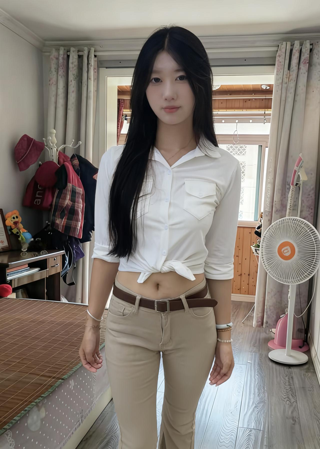 白衬衫系成结 漏出的腰腹 藏着未泯的少年意气 卡其裤的直筒线条 把青涩的莽撞 收进规整的轮廓 ~ 长发披散着 却掩不住眼里的光 像揣着一把糖 又藏着一腔勇 房间里的风扇 落满了尘 却吹不散她身上的鲜活 ~ 书桌的摆件 是童年的余温 衣架的红与黑 是生活的热闹 她站在那里 像刚从校园里走来 带着课本的墨香 也带着市井的暖 ~ 皮带扣的金属光 闪了闪 是成长的小标记 白衬衫的褶皱里 藏着不愿被磨平的棱角 ~ 风从窗缝钻进来 掀动衣角 她抬手按住的瞬间 像抓住了一截逃跑的青春 鲜活又热烈
