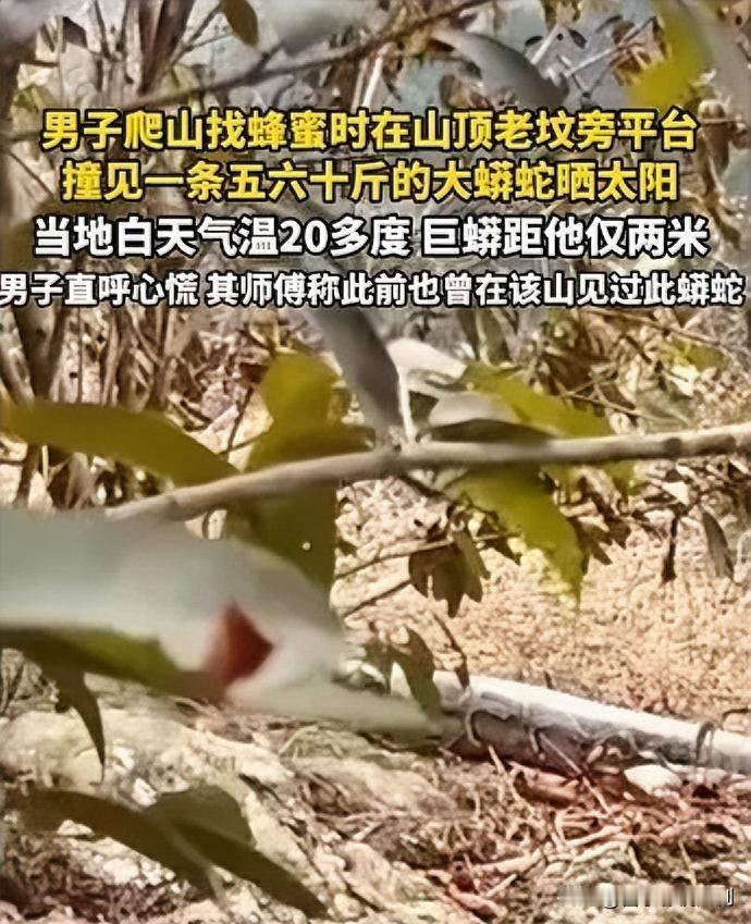 惊险!男子爬山寻蜜,撞见大蟒蛇晒太阳 近日,一男子进山找蜂蜜,本想着收获甜蜜,没想到遭遇惊魂时刻。当他小心翼翼穿梭在山林间,突然发现一条约五六十斤重的大蟒蛇,正盘在一块大石头上惬意晒太阳。蟒蛇庞大的身躯、冰冷的眼神,让男子瞬间头皮发麻。他大气都不敢出,悄悄退到安全距离。这趟寻蜜之旅,真是惊险又刺激,大家敢去野外找蜂蜜吗?