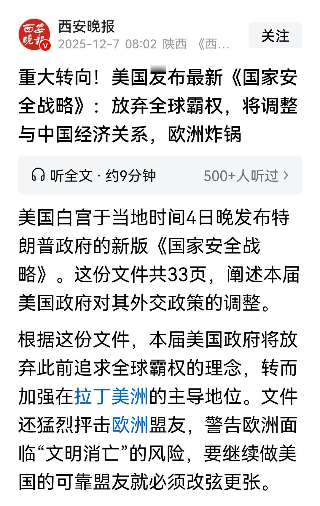 很多人兴奋地认为美国将放弃全球霸权,这种思想是极其幼稚且有害的!其实,美国只是换了一种更切合实际的打法而已。 美国迫于现状,以退为进。美国国内内现状是,债务高达35万亿美元,利息比军费还高;制造业占GDP比重降到1947年以来最低的10.1%,底特律等城市辉煌不再;2025年预计6200万人依赖多种福利;2024年芬太尼过量致死11.2万人,18到45岁男性劳动参与率低至62.3%,征兵都困难。 美国向世界示弱具有很大的欺骗性。美国收缩战线,是想先止血,重建产业筋骨,等缓过劲来,绝对会卷土重来。所以,可别被它这表象骗了。
