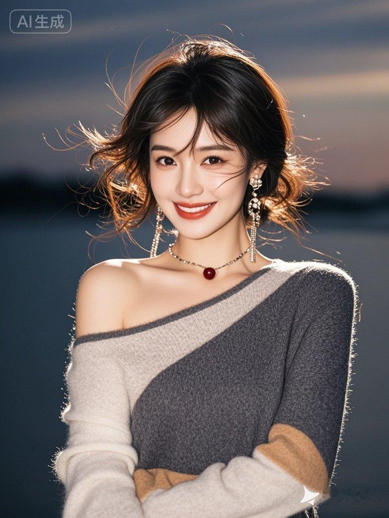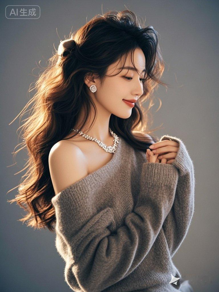 深棕色波浪慵懒随意扎发,发着光,有风吹飘飘之美,自信微笑,樱桃小嘴,瓜子脸,红润的嘴唇