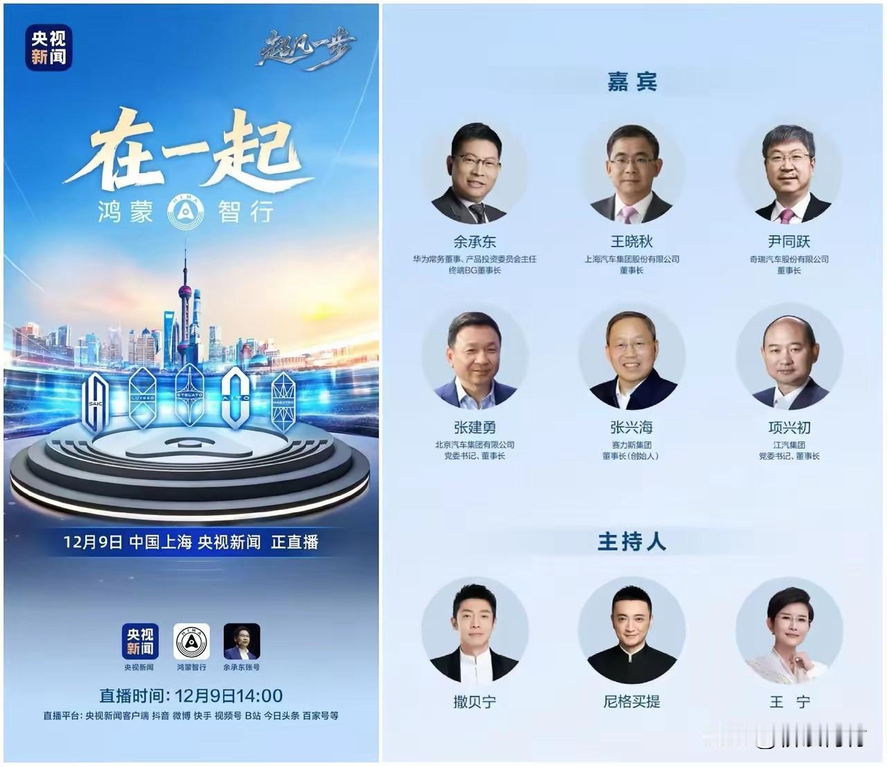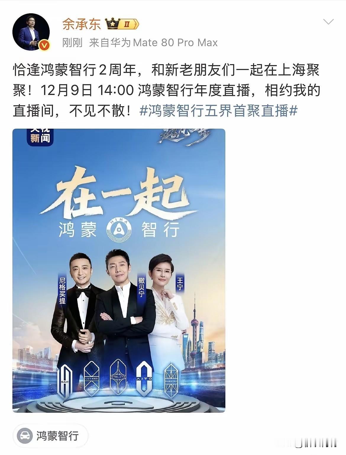 看看参加的人排面真大!余承东发文鸿蒙智行12月9日年度直播! 鸿蒙智行又来整事了,在鸿蒙智行2周年之际,今天下午将进行年度直播,这参加的人员阵容真是豪华,不仅有国家电视台的撒贝宁、小尼和王宁三位主持人,还有旗下五界的五位老总。 不知道在这次直播上又会发布什么消息,相信如此豪华的阵容肯定不会只是开个年会这么简单。 你猜会有什么信息会在直播中发布?