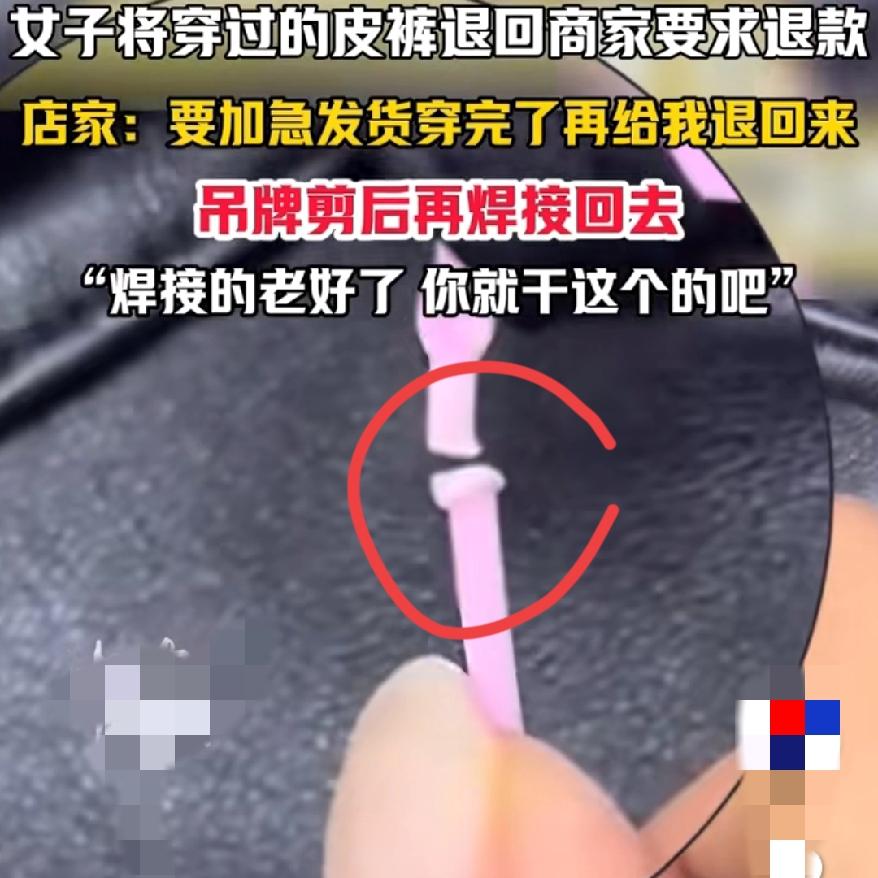 脑洞大开吊牌党 穿皮裤蹭完场合 再焊吊牌退货?这波操作真把自私玩到极致了! 店家称,客户加急买皮裤穿完剪了吊牌,居然还特意焊回去退货,关键收到货的时候,裤裆都已经有折痕了。 网购退货本是方便大家的保障,可不是用来钻空子薅羊毛的漏洞,穿够了就想全身而退,这也太自私了吧。 商家也是倒了大霉,如果不仔细检查,下一个顾客要碰巧下单,那商家更是有嘴说不清了。 这种投机取巧的操作真的能让人看得舒服吗?你遇到过哪些离谱的网购薅羊毛行为?吊牌退货 退货标签 退货吊牌 试衣服偷吊牌 退货贴 运动装退货 男装退货