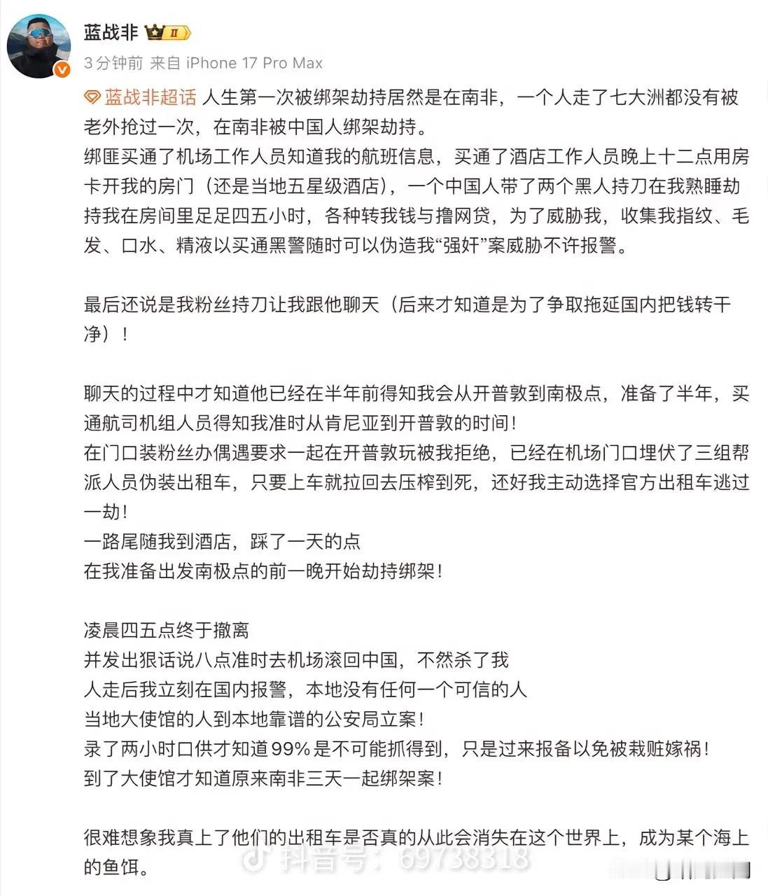 “老乡见老乡,背后捅一刀”。 知名旅行博主,蓝战非,深夜发文, 自曝在南非,开普敦遭遇精心策划的绑架勒索。令人不寒而栗的是,这次对他亮出屠刀的,不是陌生人,而是同胞。 蓝战非此行原本是为了筹备前往南极点的行程,却没想到在号称“五星级”的酒店里,遭遇了人生最大的至暗时刻。 蓝战非旅游记录 蓝战非旅游 蓝战非收入 绑匪身份:中国主谋 + 黑人打手 这并非普通的街头抢劫,而是一个跨国犯罪团伙的精密作业。 * 核心主谋: 一名中国人(同胞)。 * 执行打手: 两名当地黑人。 * 幕后布局: 据蓝战非透露,这伙人早在半年前就开始布局。他们买通了航空公司的机组人员,精准掌握了蓝战非从肯尼亚到开普敦的航班动态。 哪个酒店?五星级酒店的“内鬼”之痛 这是最让人感到绝望的细节——安全防线的层层失守。 蓝战非入住的是当地一家五星级酒店。绑匪之所以能得手,是因为买通了酒店内部工作人员。 惊悚一幕: 凌晨12点,绑匪没有撬门,而是直接用房卡刷开了蓝战非的房门。这意味着,在号称最安全的私人空间里,受害者其实是“裸奔”的。 5小时炼狱:如何被绑架的? 这是一场经过精密计算的“围猎”。蓝战非其实曾两次逃过一劫,但最终还是没能躲过内鬼的毒手。 1. 第一道关卡(机场逃脱): 绑匪原本在机场安排了假出租车和伪装成粉丝的人,试图在落地时就将他绑走。蓝战非保持了警惕,拒绝了“粉丝”的邀请,坐上了官方出租车,从而逃过了第一劫。 2. 第二道关卡(酒店失守): 绑匪通过内鬼掌握了蓝战非的房间号,并在深夜利用房卡进入房间。 3. 持刀劫持: 凌晨时分,一名中国男子带着两名黑人持刀闯入。蓝战非被控制,这场噩梦持续了4到5个小时。 损失多大?金钱与尊严的双重掠夺 关于具体的金额,蓝战非在文中并未详细列出,但透露了绑匪的手段极其专业且贪婪: 洗劫账户: 绑匪逼迫蓝战非转账,清空了他当时能操作的所有账户余额。 网贷榨干: 不满足于现有存款,绑匪还逼迫蓝战非下载APP,借了大量的网络贷款,直到榨干所有信用额度。 生物信息窃取: 这是最令人毛骨悚然的一点。绑匪收集了蓝战非的指纹、毛发、口水,甚至是精液。 目的: 为了买通当地的“黑警”,一旦蓝战非报警,他们就准备伪造现场,反咬一口制造“蓝战非强奸案”,以此来威胁他不敢声张。 结局:花钱买命,狼狈回国 直到凌晨4、5点,绑匪确认钱已转走、网贷到账后才离开。临走前,他们威胁蓝战非必须在早上8点前准时去机场回国,否则就要他的命。 蓝战非在文中感叹,事后去报警,警方告知破案率极低(99%抓不到人)。他也从大使馆处得知,南非平均三天就会发生一起针对华人的绑架案。 深度反思:为什么是“他”? 这起案件给所有出国旅游的人敲响了警钟: 1. 高调的代价: 蓝战非作为千万级网红,其行踪、收入在互联网上是公开的。在某些犯罪分子眼中,他们就是“行走的ATM”。 2. 最毒不过“自己人”: 很多时候,危险不来自陌生的环境,而来自那些说着同一种语言、假装热情的“老乡”。他们熟悉我们的心理防线,更容易骗取信任。 3. 信息泄露: 从航空公司到酒店,任何一个环节的内鬼都可能置人于死地。
