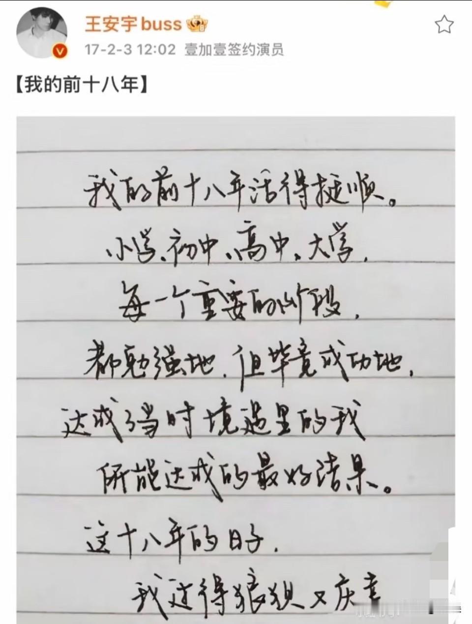 王安宇的字很有笔锋。安宇特像小巷人家里演的,从小到大都很顺利即便一直学习不好最后还是考上了好大学,毕业了还挣到了老多钱,这不就是现实安宇翻版吗?![吃瓜群众] 不过…他现实中学习很好,典型的江浙沪爸妈有好好培养的小孩,从小也注重练字,而且是我们这重点高中的文科生哦~[赞]王安宇名场面 王安宇演技