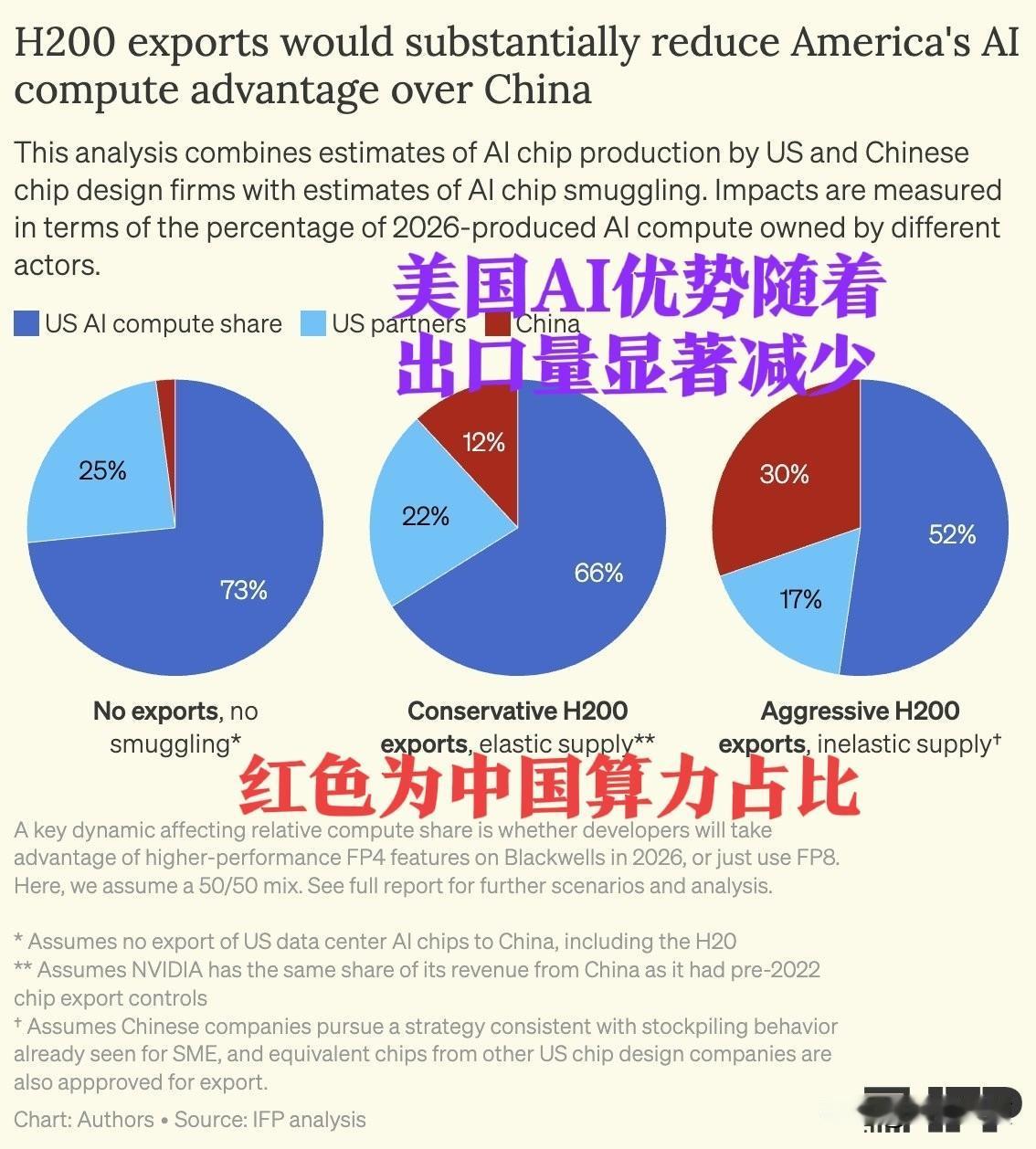 这突如其来的关心?特朗普昨夜宣布放松英伟达H200芯片的出口,给中国AI行业添砖加瓦的同时,英伟达上缴25%给美国。 他认为这也为美国制造业带来重大利好,反正就是一阵吹。 西方那边各种【智库】不干了,西方研究机构很快做出了预测:【出口越多,美国的AI算力优势被挤压得越多】。 由于H200使用的台积电4纳米工艺,其性能是阉割版H6的6倍以上,这会为中国的AI最前沿模型在深度和广度上带来巨大的积极影响。哪怕美国在GPU芯片上存在代差压制,可算加上成本和效率优势……谁在乎你那超额用不掉的算力优势呢?