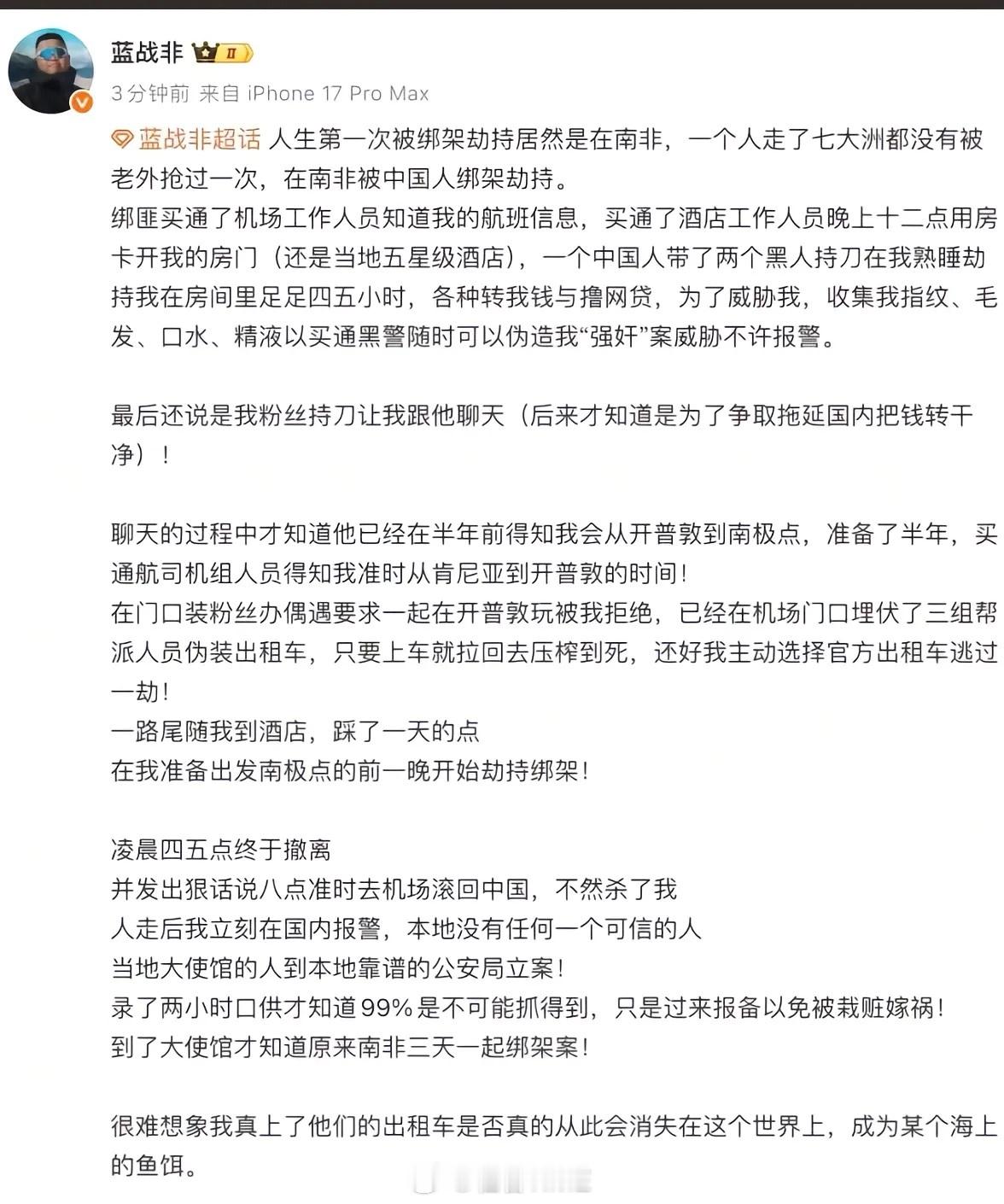 蓝战非称被绑架蓝战非的节目确实好看,看过好几个视频,全世界各地都会有粉丝跟他打招呼。他穿拖鞋,看起来不像有钱人,辨识度高,这把双刃剑让不法分子有了可乘之机。今后的旅行,他真的还注意注意安全的问题了。