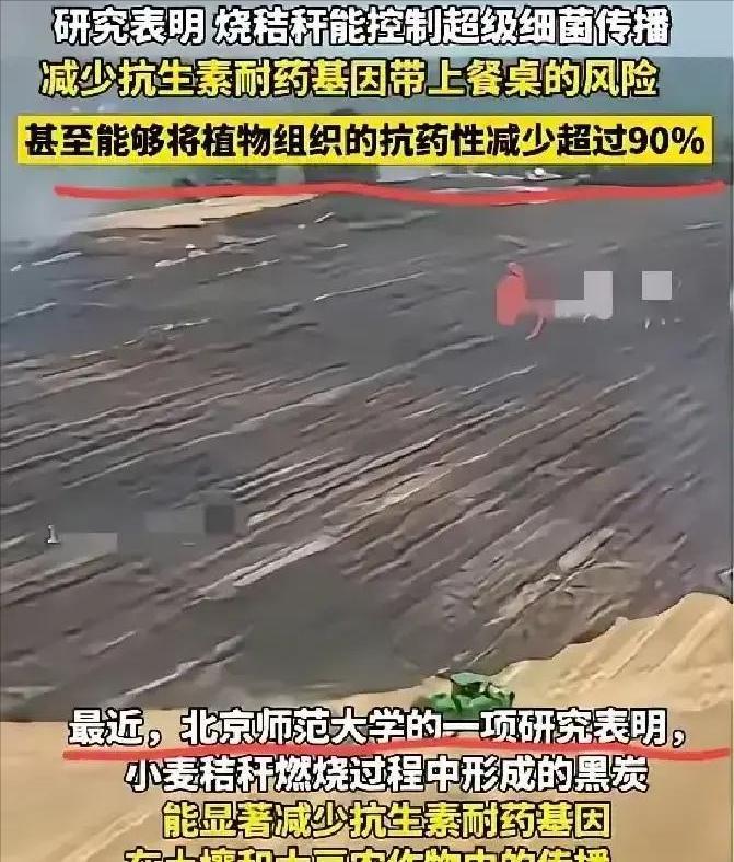 谁想得到,过去各地严防死守、农民一烧就罚的秸秆焚烧,如今居然反转了。 北师大最新研究,秸秆烧出来的黑碳,能一把干掉农作物里90%以上的抗生素耐药基因,简直是把超级细菌钻进食物链的路给掐断了! 想想早些年,为了蓝天保卫战,全国不少地方都搞起了“全域禁烧”。那时候大气考核压力大,基层干部也难。像湖南常德,2019年以后,卫星拍到个火点就扣10万,干部们整天得下田巡查,累不说,老百姓还不理解。 农民就更难了。收了庄稼,秸秆咋办?还田吧,费劲又花钱;离田吧,运费也得自己掏。偷偷点一把火,省事儿,可一旦被抓,罚款不说,连耕地补贴都可能受影响。就像贵港平南今年开春那几起,烧个两三平米,罚500块,还得担惊受怕。 那时候,所有人的注意力都在天上的烟,却没人想到,脚下的土里正悄悄埋着个更大的雷——抗生素耐药基因。 这东西通俗讲,就是让细菌变成“超级细菌”的坏种。2013年,全国抗生素用量就有16万吨,一半多都用在养殖业。这些药动物吸收不完,随着粪便进了农田。再加上医疗废水、药厂废料的“助攻”,地里的抗生素残留越来越严重。 更糟的是,现在种地普遍用地膜,甭管是普通的还是可降解的,最后都会变成微塑料。这些碎片会搅乱土壤微生物,让耐药基因传得更快、更广。 有数据显示,长三角曾有近60%的儿童尿检里检出抗生素残留。更吓人的是,扬州大学团队甚至在猪肉里发现了携带耐药基因的高毒力肺炎克雷伯菌——这要是通过食物进了人体,普通抗生素根本治不了,想想都后背发凉。 就在大家为这看不见的威胁发愁时,北师大的研究来了个“逆转”。 实验发现:单独的地膜残留,15天就能让土壤耐药基因增加38%。但只要加入秸秆焚烧产生的黑碳,早期就能压住30%-50%的增长;等到大豆成熟时,豆根、豆叶甚至豆粒里的耐药基因,竟然能被削掉90%以上! 而且,烧秸秆虽然短期内会扰动土壤微生物,但三个月左右它们就能恢复,不会留下长期伤害。 后来,宁波和浙大的团队在稻田里也验证了:烧秸秆能减少稻茬里的致病菌,还能打断致病菌和耐药基因之间的“勾连”。这下,秸秆焚烧的“隐藏技能”算是被坐实了。 看到这,我真是长舒一口气。过去我们只盯着那缕烟,却忽略了它带来的黑碳,能通过改变土壤性质、重塑微生物群落,把耐药基因的传播路径给堵死。这简直是意外找到了对抗超级细菌的一条“土方子”! 政策也紧跟着科学在调整。2025年中央一号文件明确提出,要推进秸秆综合利用,精准划定禁烧区。 像湖南津市,就从过去的“全域禁烧”变成了“分区管理”:城区和主干道附近坚决不让烧,但偏远的农田,在非污染天气里,可以有计划地烧。这样既保了蓝天,又给农民解了难,还顺便防了超级细菌,一举三得。 我觉得,当初的全域禁烧是特殊时期的无奈之策,而今天的科学发现,正是治理走向精细化、科学化的证明。它告诉我们,什么事都不能一刀切。有时候,换个角度看,过去的“敌人”或许就是今天的“朋友”。 其实,很多民间的老农早就凭经验感觉到了。 评论区有不少人分享经验: “我那两亩地,年年发稻瘟病。去年冬天心一横,把稻草烧了,今年早稻一点病没有,虫也少了,省了两遍农药,产量还高了!” “老祖宗几千年都这么烧,还用研究?烧过的地方,第二年庄稼就是长得旺、果实结得实。” “八几年那会儿都烧,也没见有雾霾。后来不让烧了,雾霾倒厉害了。问题到底出在哪儿?” “烧秸秆能烧死虫卵病菌,苗出得齐、长得壮,现在不让烧,苗期就得打好几遍药。” 所以你看,从“雾霾元凶”到“超级细菌克星”,这个转变不仅是科学的胜利,更提醒我们:治理得接地气,得听民声,也得信科学。 只有这样,才能既守住蓝天白云,又护好我们的一日三餐,那才是真正的两全其美。