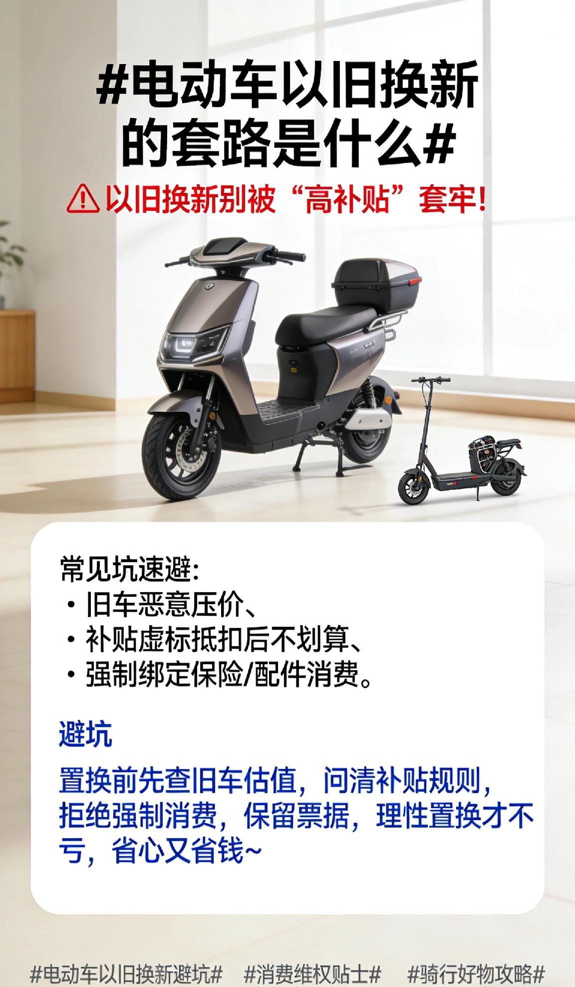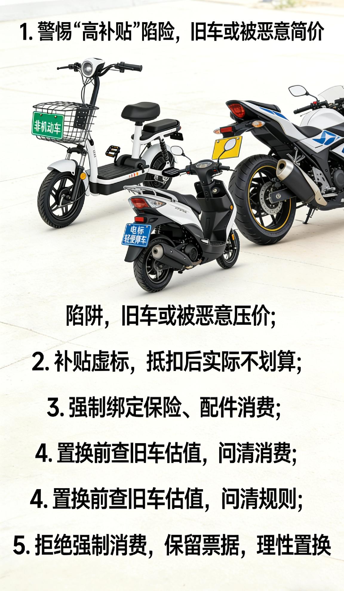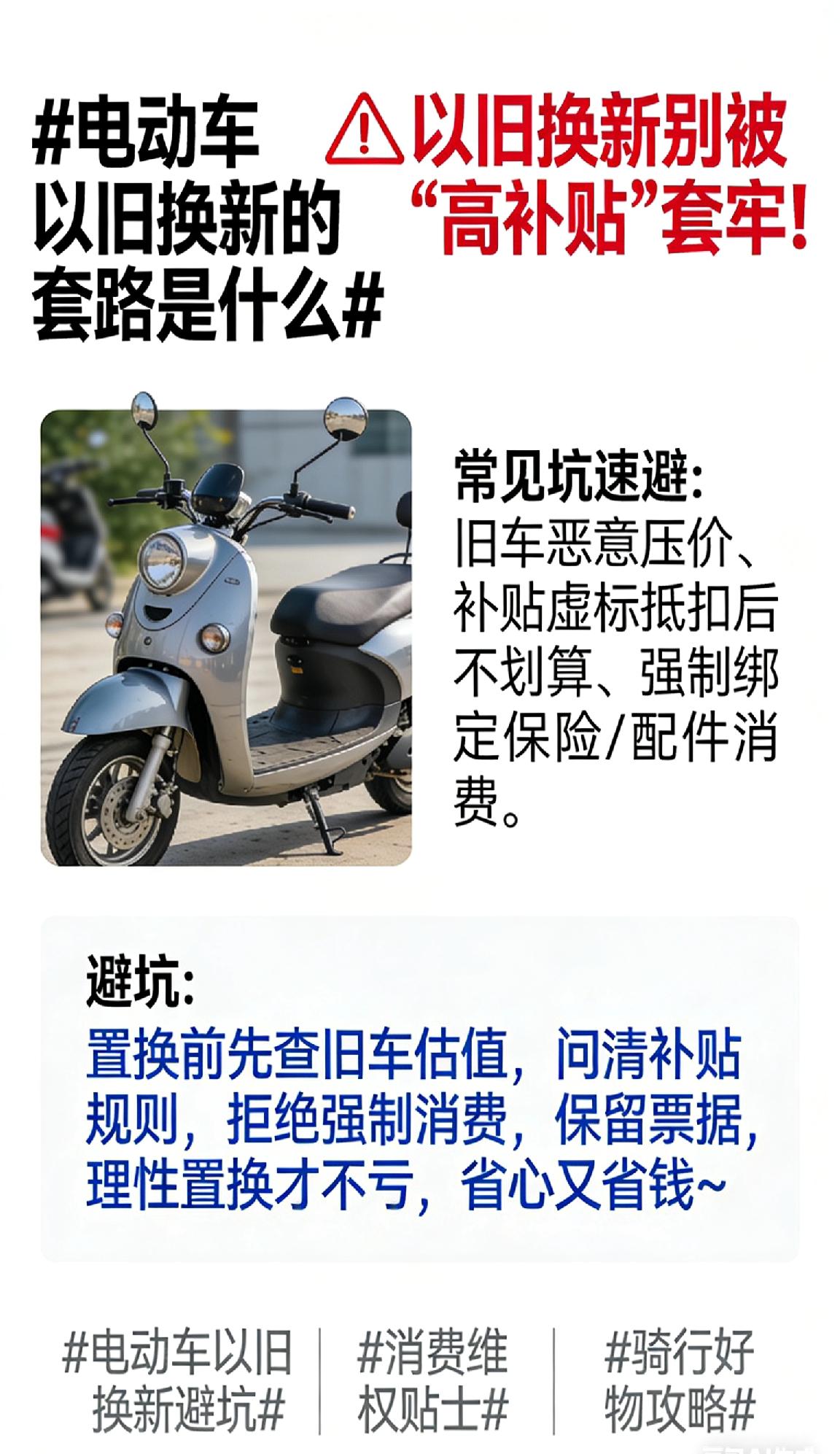 以旧换新别被“高补贴”套牢!常见坑速避:旧车恶意压价、补贴虚标抵扣后不划算、强制绑定保险/配件消费。置换前先查旧车估值,问清补贴规则,拒绝强制消费,保留票据,理性置换才不亏,省心又省钱~(个人观点,仅供参考!) 电动车以旧换新避坑 消费维权贴士