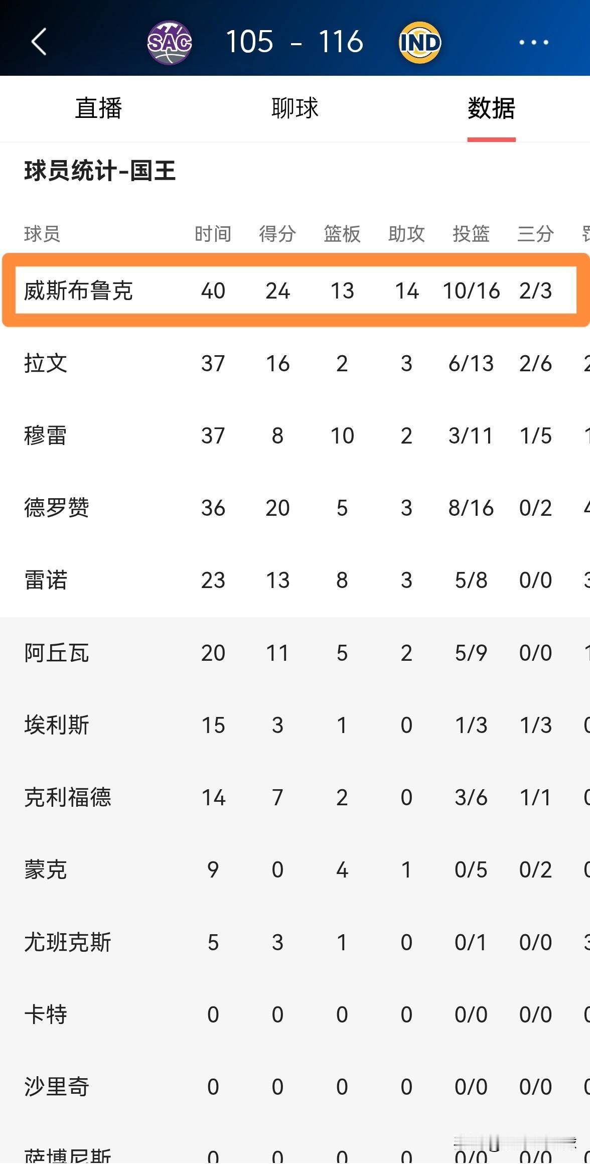 在刚刚结束的一场NBA常规赛中,国王在客场以105:116输给了步行者。值得一提的是,本场比赛,国王老将威斯布鲁克在攻防两端都倾其所有,威少在鏖战的40分钟里,投篮16中10,其中三分球3中2、罚球4中2得到24分13篮板14助攻2抢断1盖帽,他的场上正负值为-7。 平心而论,本场比赛威少真是虽败犹荣,他在比赛结束以后受到了步行者年轻球员们的热烈欢迎和尊重。