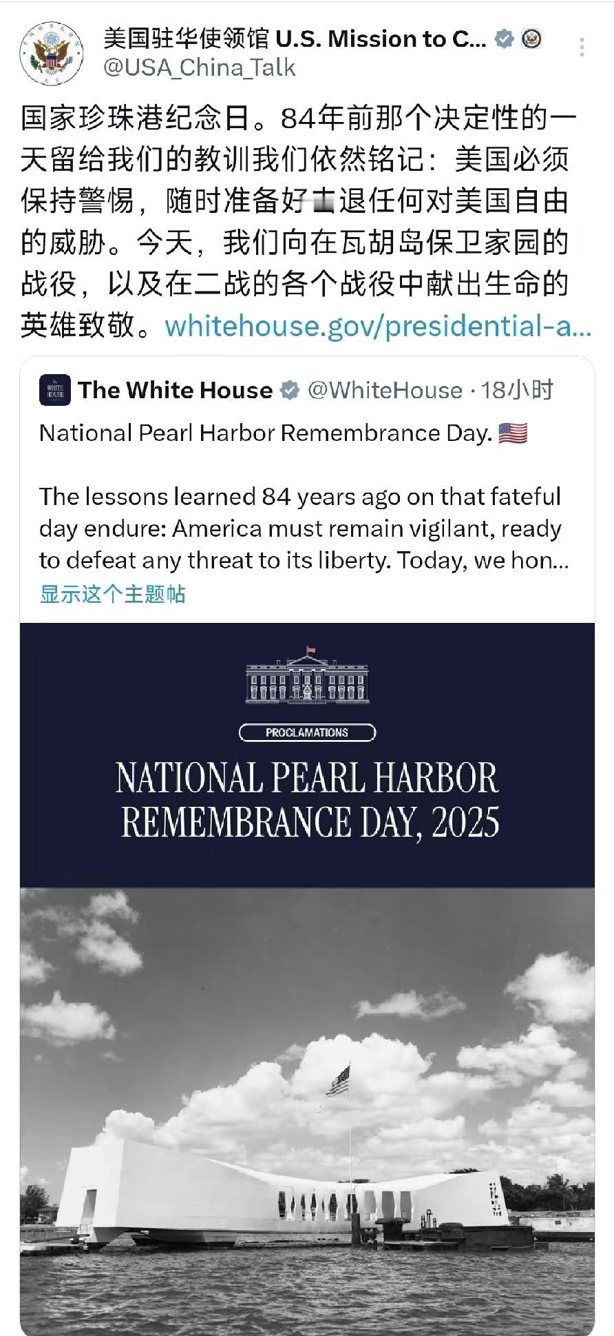 美国驻华使领馆突然发文纪念珍珠港事件,字里行间满是“警惕威胁”的呼吁。可仔细一品,这话里似乎缺了关键的名字——当年是谁发动了偷袭?如今谁在纵容历史阴影重现? 珍珠港的伤痛刻在几代人记忆里,但选择性纪念反而模糊了真相。当年军国主义的铁蹄踏破了太平洋宁静,如今某些势力却悄然为历史罪行“松绑”。若真牢记教训,就该看清威胁从何而来。 历史不是任人打扮的舞台剧。战后国际秩序用鲜血筑成,为的是永绝战争祸根。但当昔日侵略者的军舰再次游弋敏感海域时,那些高喊“自由保卫”的声音为何沉默了? 真正的警示应像明镜照彻古今。二战告诉我们,姑息纵容必酿大祸。若只盯着远方模糊的“威胁”,却对身边复活的军国主义幽灵视而不见,这究竟是健忘还是妥协? 太平洋足够宽广,容得下所有和平力量。但前提是,每个人都得对历史有份完整的答卷。纪念碑上铭刻的不仅是牺牲,更是人类对和平的誓言——这份誓言需要共同守护,而不是单方面说教。