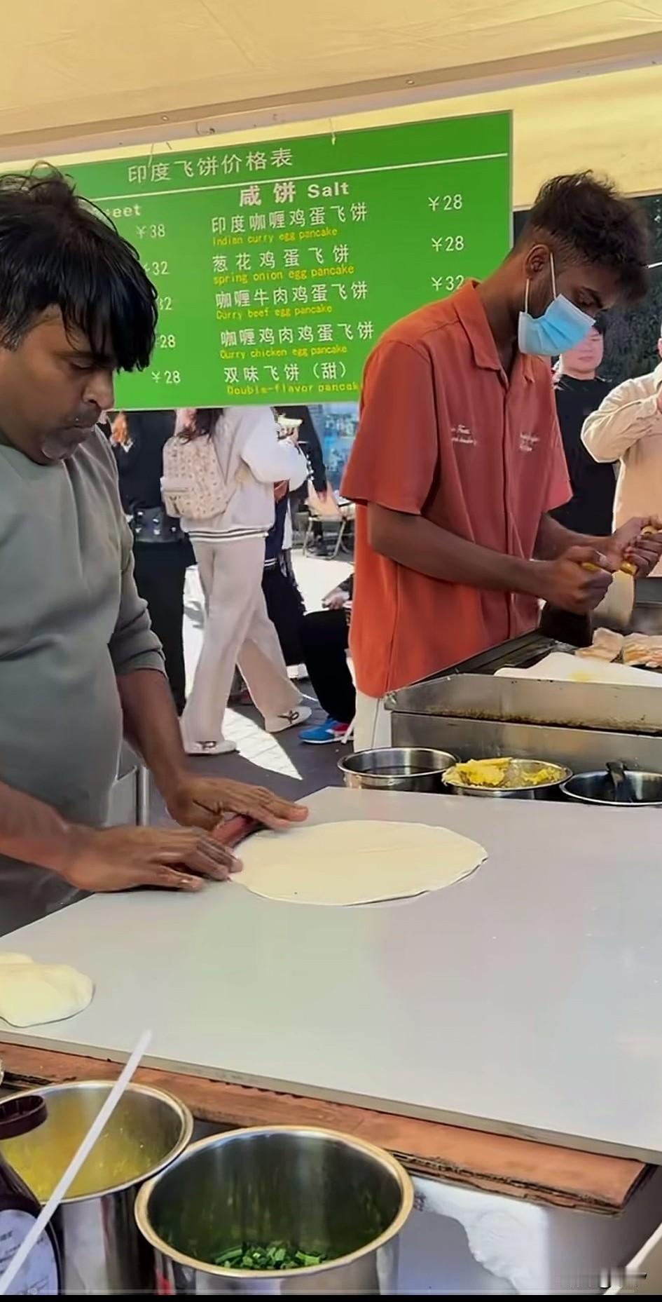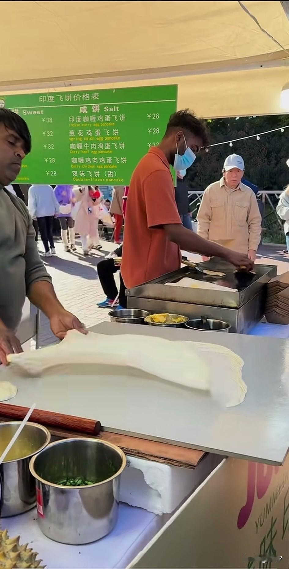 印度人在北京开了飞饼店, 卖的还不便宜, 最便宜的要数印度咖喱鸡蛋飞饼, 一个28块钱, 像咖喱牛肉鸡蛋飞饼, 一个卖32块, 两个印度人光着手, 在面团上来回揉搓, 随后将打好的面皮, 放在机器上开始了烙饼, 周围经过的行人, 出于好奇都会来看一会, 实际上这不就是中国的饼吗? 很多人都会去做这种菜饼, 一个最多卖8块,10块的, 让印度人一制作, 就是印度飞饼, 价格直接翻了几倍? 看着他们黑色的双手, 制作的面饼, 不知道是哪些人这么喜欢吃, 一个饼卖28,32元虽然没有倒闭, 看来当地人还是有喜欢吃的, 一位大爷就被他们制作手法吸引了, 可能是比较好奇, 拿起手机了开始拍摄, 大家对于北京的印度飞饼怎么看? 钟爱异国美食 印度人飞饼 印度美食飞饼 印度飞饼辣片儿 印度飞饼脆辣片 汕头印度飞饼