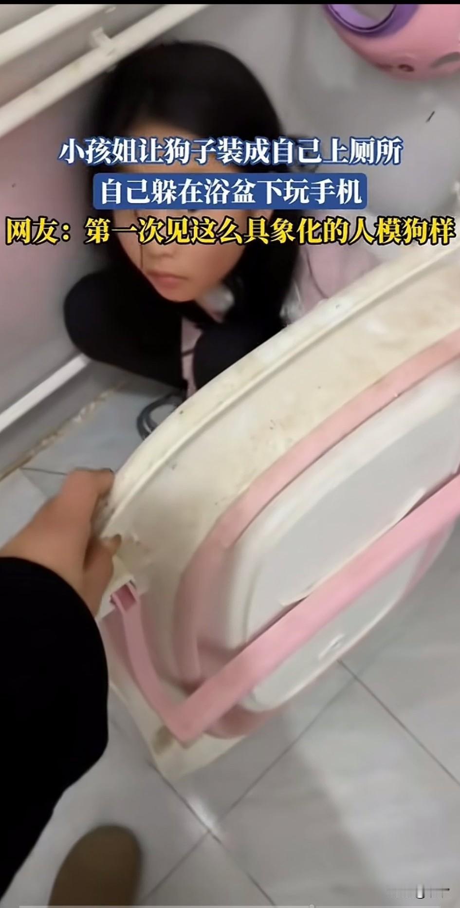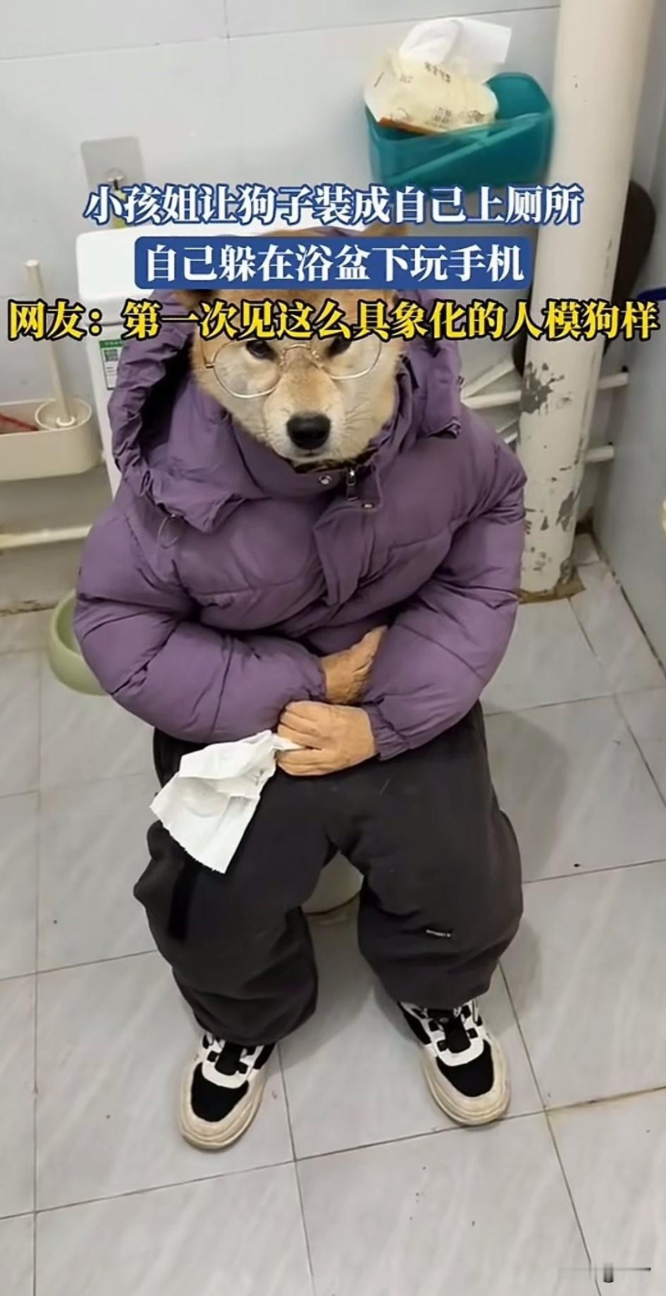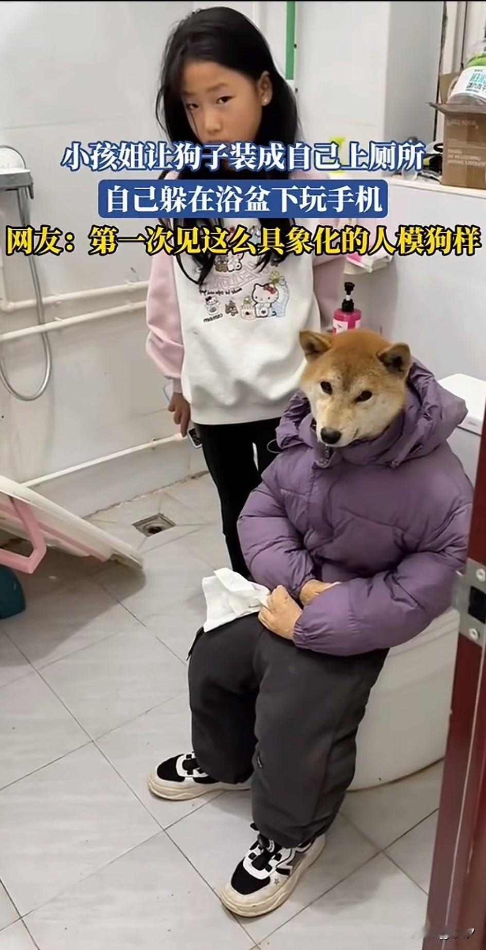看到一小女孩躲在厕所玩手机, 为了不让父母发现, 她把她家的小狗穿上了人的衣服, 还做出了裤子和鞋的造型, 就这样小狗坐在马桶盖上, 戴着羽绒服的帽子, 看着和真人一样, 人模狗样原来就来自这里, 家长看孩子在厕所时间久, 就直接进门看了看, 差点就以为还在上厕所, 走近后才发现原来是小狗, 发现孩子躲在旁边的浴盆后面, 正在偷偷的玩手机, 手机到底是谁发明的? 原来只是一个通话工具, 如今功能太多了, 成了小孩子戒不掉的物品, 大家对于这么聪明的女孩怎么看? 奋进新山东 社会百态 带狗子上厕所 小狗女孩 女孩带小狗 厕所带狗