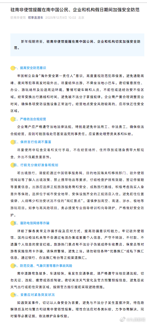 【#驻南非使馆提醒中国公民加强防范#】新年假期将至,驻南非使馆提醒在南中国公民、企业和机构切实加强安全防范。一、提高安全防范意识牢固树立自身“海外安全第一责任人”意识,高度重视防范犯罪侵害。避免通勤高峰、夜间等犯罪高发时段外出,尽量结伴出游,不乘坐当地小巴车。密切留意居住、办公、游玩场所及沿途周边环境,警惕可疑车辆和人员,不前往或途经治安不佳区域。经常变换出行路线和时间,避免被不法分子掌握规律。企业商户要合理调整营业时间,确保各项安防设施设备正常运行。经营地点安全风险较高的,应尽快迁往安全区域。二、严格依法合规经营企业商户应严格遵守当地法律法规,特别是避免非法用工、非法务工,确保依法合规经营,否则可能面临处罚甚至追究刑事责任。应妥善处理劳资关系和纠纷。三、保持言行低调不露富尽量使用非现金交易和支付手段,不在经营场所、住所存放或随身携带大额现金,外出不佩戴贵重首饰。四、行前充分做好准备和规划若出境旅行,请提前通过中国领事服务网,目的地国海关和移民部门、驻外使领馆网站等了解入出境政策、禁止携带物品等要求,仔细检查护照有效期、签证停留期等重要信息。出游应选择正规旅游服务商和安全、成熟旅行路线,积极考虑购买人身意外等保险。选择位于城市安全地带、安保设施齐全的正规酒店入住。避免前往位置偏僻、人烟稀少和治安状况不佳的“网红景点”。谨慎参加高空、高速、涉水、极地等游玩项目。如参与高风险项目,务必接受专业指导培训和向导陪护,严格做好安全防护。五、谨防电信网络等诈骗详细了解各类常见诈骗手段及应对方式,提高防骗意识和能力。牢记驻外使领馆、国内公检法机关等不会通过电话办案或索要个人信息,严守不转账、不付款、不透露个人信息的安全红线。旅游热门景点有不法分子伪装成停车收费员、保安员等对游客实施信用卡诈骗,请保持警惕,避免上当。请勿轻信各种“优惠换汇”或私下换汇信息,通过银行、合法换汇柜台等正规渠道换汇。六、防范交通、气象灾害等意外事故风险南非道路弯急坡多、车速较快,易发生交通事故,请严格遵守当地交通法规,切勿无证、违规、疲劳或酒后驾驶。密切关注天气变化及官方预警预报信息,避免恶劣天气出行或前往灾害区域,按照官方指引提前采取避险措施。七、妥善应对紧急突发状况如遇突发事件,切记以人身安全为首要,避免与不法分子发生直接冲突,待危险解除后及时向警方和驻南非使领馆报案。理性合法应对各类纠纷,力争协商解决,同时留存必要证据,依法维护自身权益。