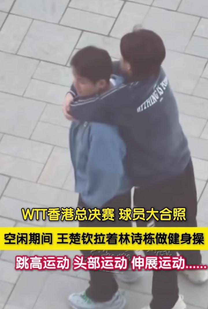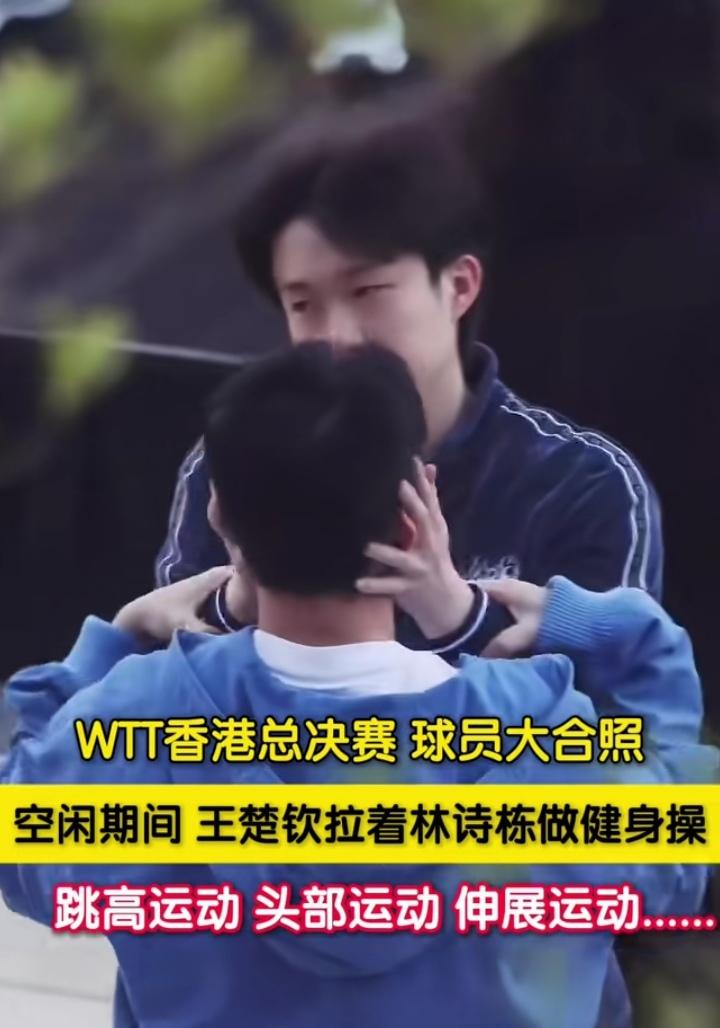在香港总决赛大合影的空闲时间,王楚钦林诗栋玩嗨了,王楚钦直接拉着林诗栋做起了健身操!跳高运动、伸展运动、头部运动轮番上阵,那场面简直不要太欢乐。 两人脸上洋溢着灿烂的笑容,可爱值直接爆表!王楚钦这带动气氛的能力绝了,林诗栋也是积极配合,他俩就像两个调皮的大男孩。这画面谁看了不迷糊啊!我直接被狠狠拿捏,感觉心都要被他们的可爱融化了。