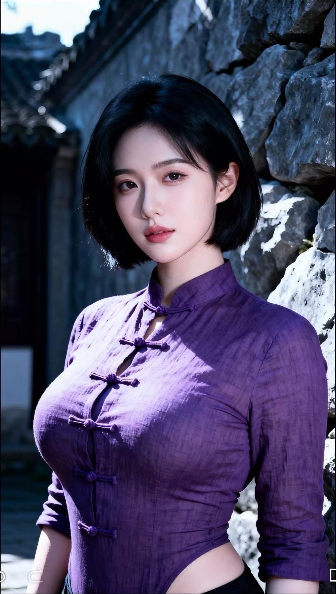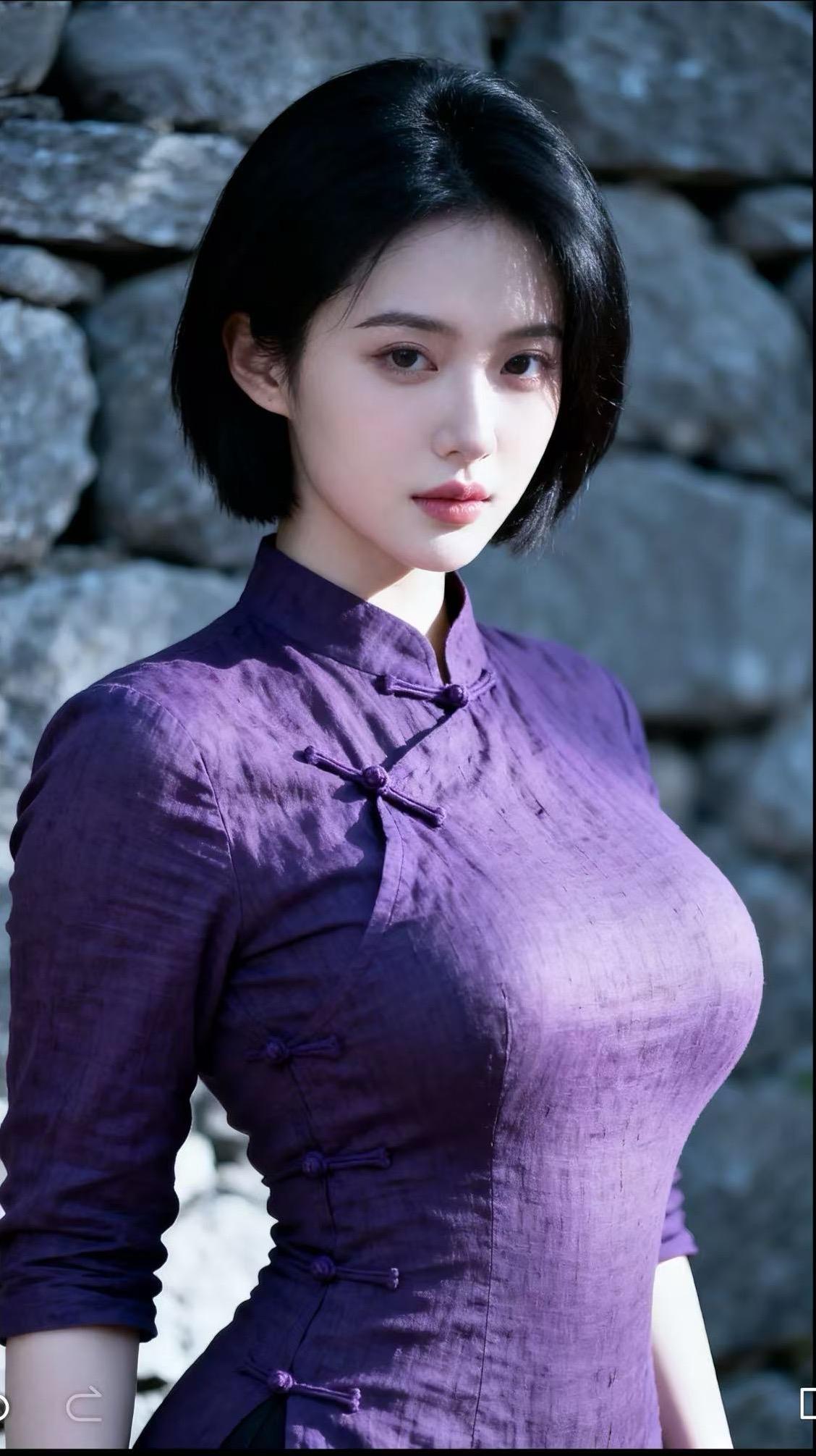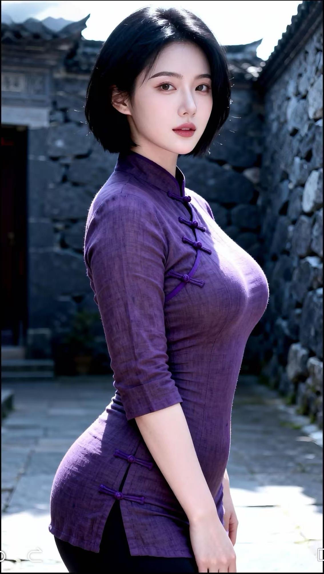 紫韵风华 她身着一袭典雅的紫衣,宛如从旧时光中款款走来。立领设计衬出修长脖颈,盘扣精巧,似在诉说着传统韵味。短发利落,面容沉静而温婉。阳光洒落,为她的轮廓镀上一层柔光。她站在那里,便成了一道风景,将东方女性的含蓄之美与旗袍的婉约魅力完美融合,尽显风华。