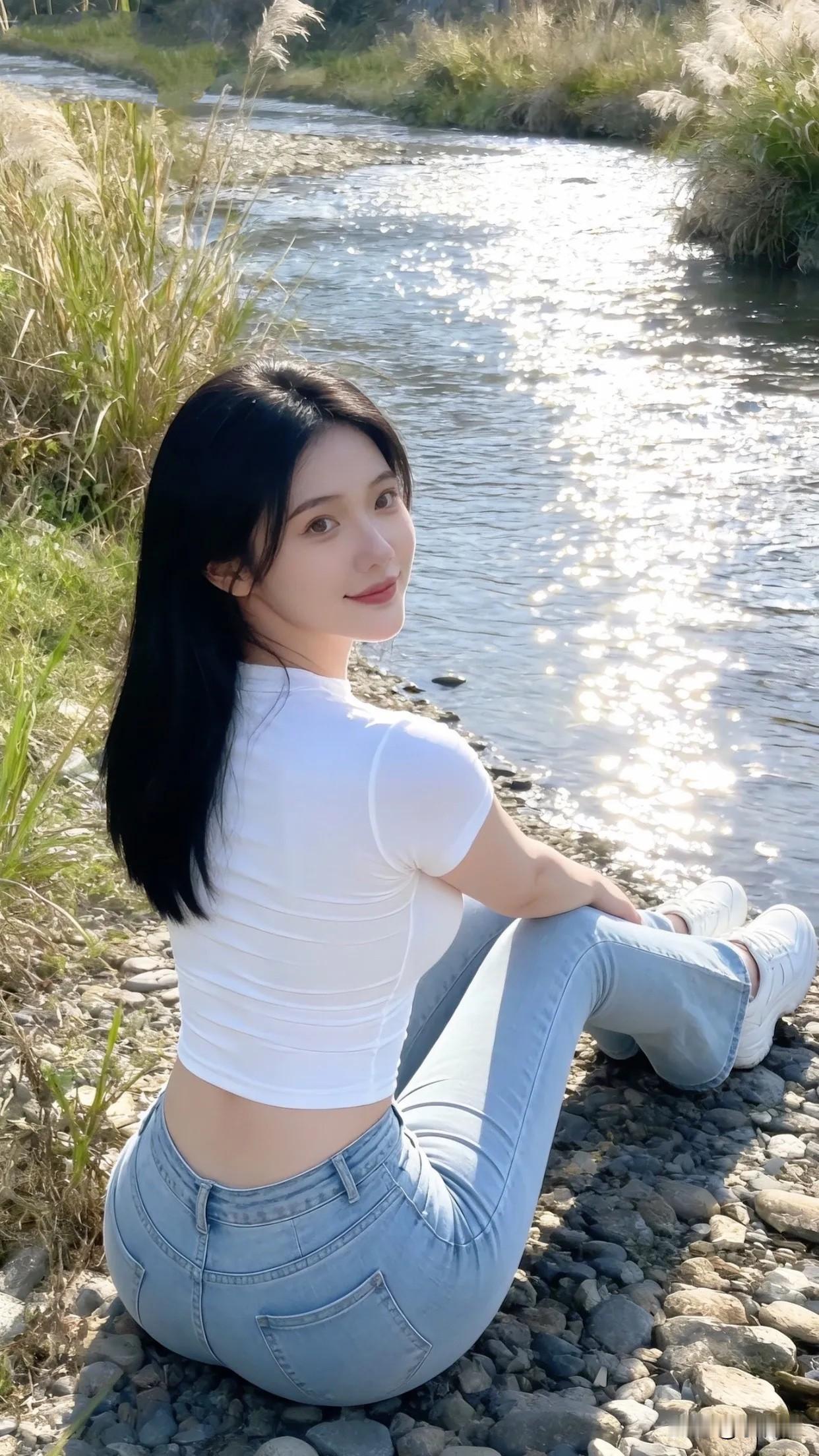 《溪畔晴光》 素衫裁取晴光软,牛仔轻笼玉色弯。 石岸风拈芦穗雪,回身笑落一溪斑。 发梢垂蘸溪头影,露褶初匀背角纱。 纤指挑开云底日,春痕漫过碧苔沙。 蹲时臀畔蓝波起,坐处腰边白浪斜。 最是回眸涡浅处,流光粘在鬓边花。 溪声漱石分晴色,草气萦衣裹暖霞。 腕底芦茎摇碎汞,眉间笑靥晕成霞。 裤边漫染矶头露,屐底偷粘岸畔芽。 转眄忽惊波面皱,游鳞衔走半簪华。 晴光织就身如缟,软翠堆来鬓似鸦。 久坐不知风渐软,余晖沾透薄衫纱。