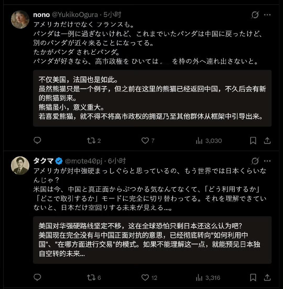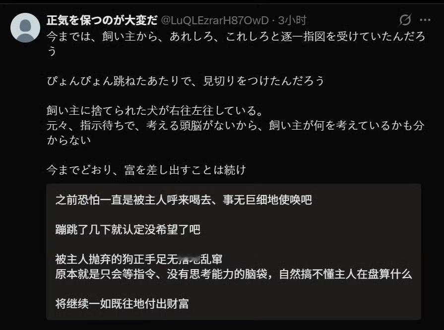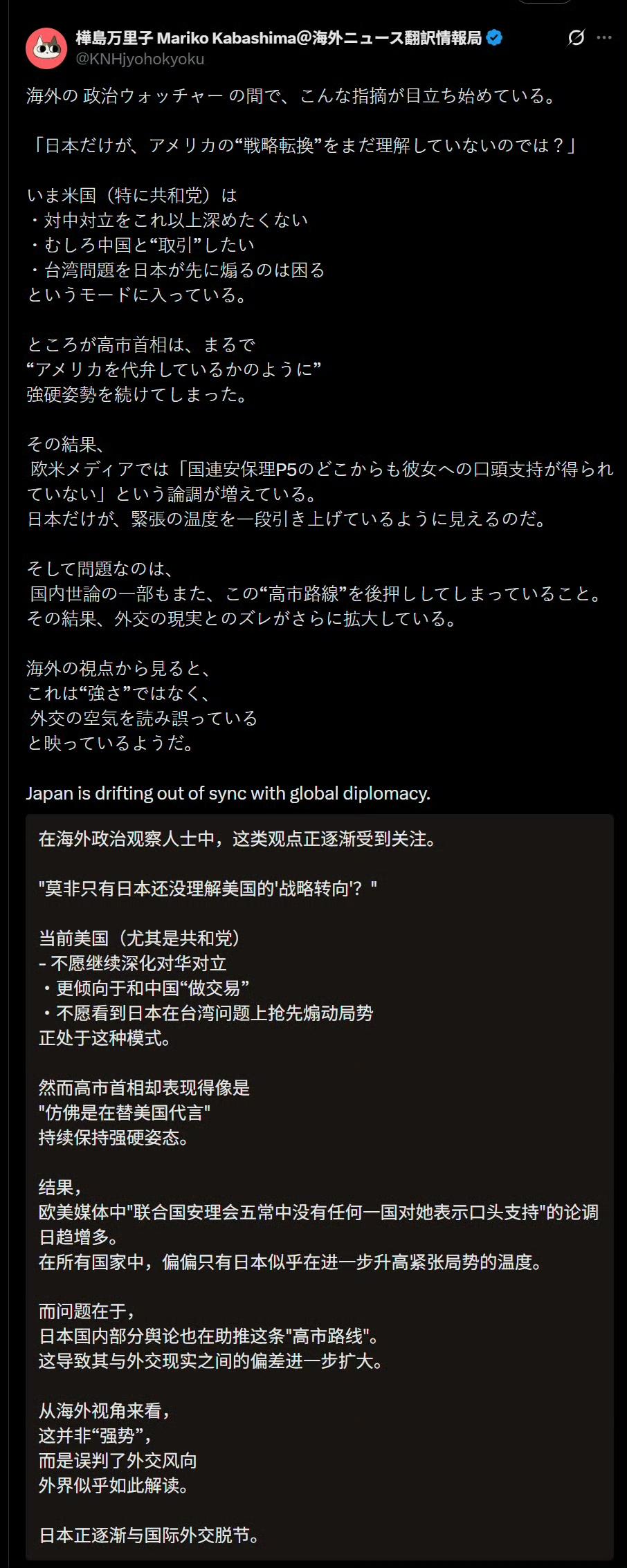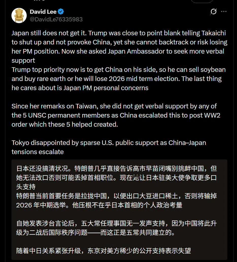 一些日本人发现五常没一个人支持日本的外交立场。发现日本正在被“盟友”抽走梯子,日本正在独自空转。 “之前一直是被主人呼来喝去、事无巨细地被使唤。蹦跳了几下就认定没希望了吧。被主人抛弃的狗正手足无措地乱窜。原来就是只会等指令、没有思考能力的脑袋,自然搞不懂主人在盘算什么。日本只有继续一如既往地付出财富的份。” 主要大国的共识,似乎只有日本搞不清状况。鬼子眼里所谓的盟友,都吃着二战战后秩序的红利,谁会公开反对自己?那不就是傻大个吗? 老美:你的事就是你的事,你要自己面对,和我无关。我还想着出口大豆和进口稀土呢?!别来打扰我。 三十六计之——上屋抽梯,让你一个人在高处的风中凌乱。