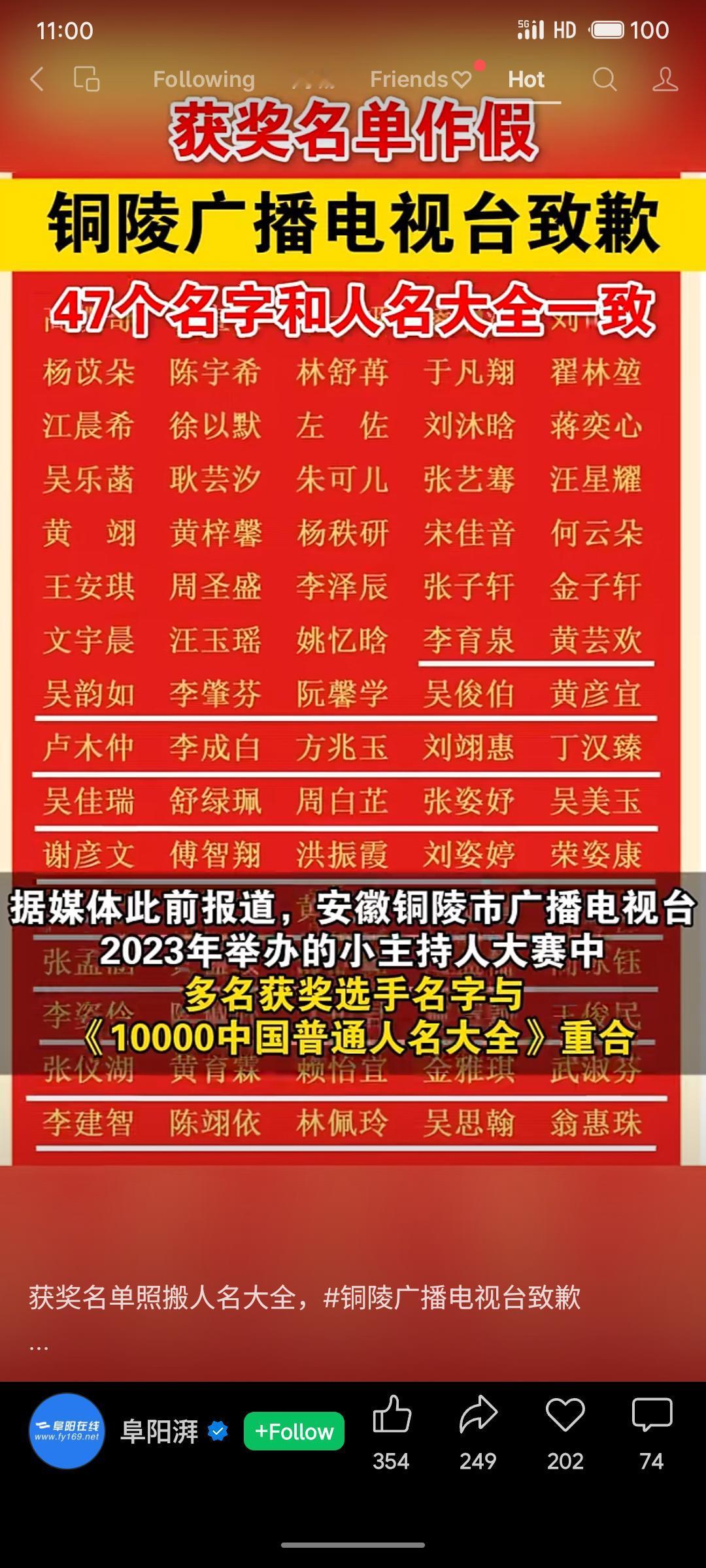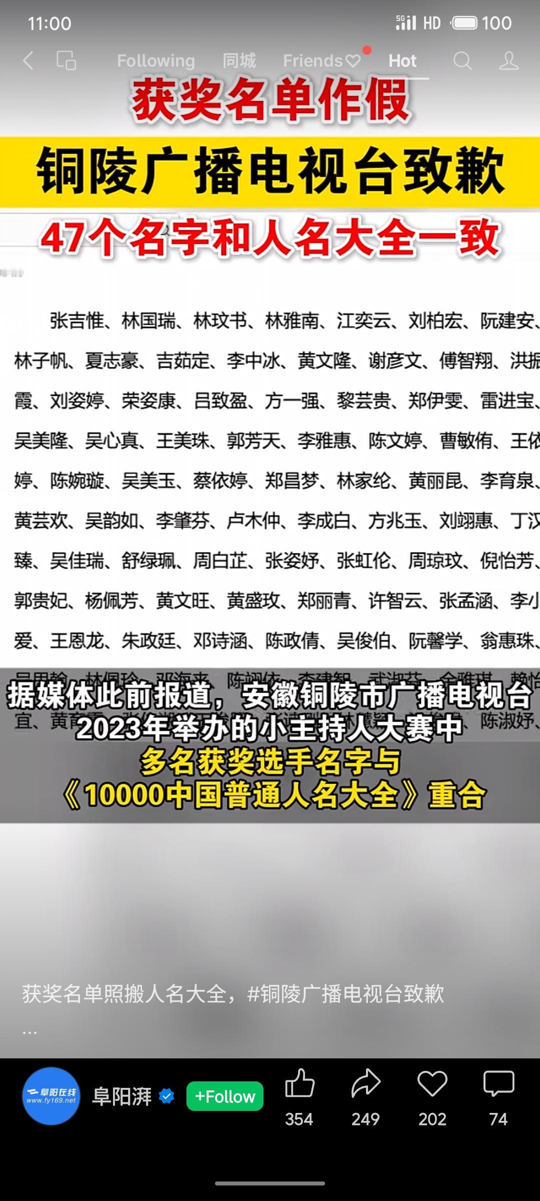 安徽铜陵广播电视台被曝其2023年小主持人大赛获奖名单涉嫌造假,大量姓名与网络“人名大全”雷同。官方致歉称系承办方为虚张声势擅自复制,已终止合作并追责。此事暴露活动监管形同虚设,严重损害公共机构的诚信与公信力。