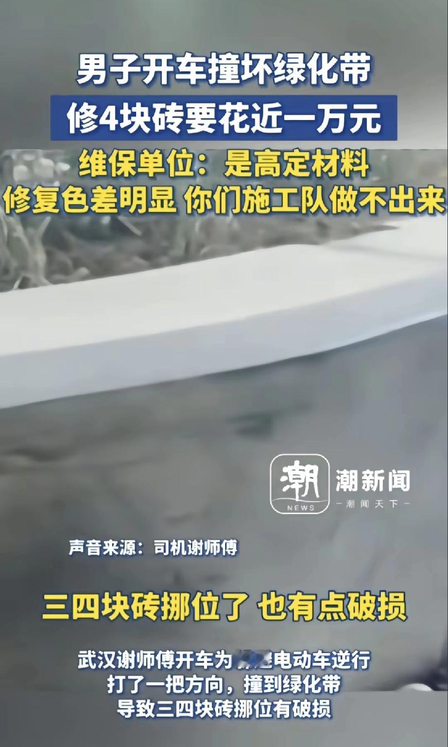 武汉的谢师傅开车时为了躲逆行的电动车,不小心撞到了绿化带,弄坏了几块砖。他本来以为修一下没多少钱,结果一问,维保单位说这是“高定材料”,修复要近一万元。 对方说这种砖颜色特殊,普通施工队做不出来,换了会有色差,所以必须由他们统一修复,价格自然就高了。 谢师傅这下傻眼了——几块砖居然这么贵。能走保险还好点,要不然这也太坑人了,以后开车可真得再小心点公共设施了。