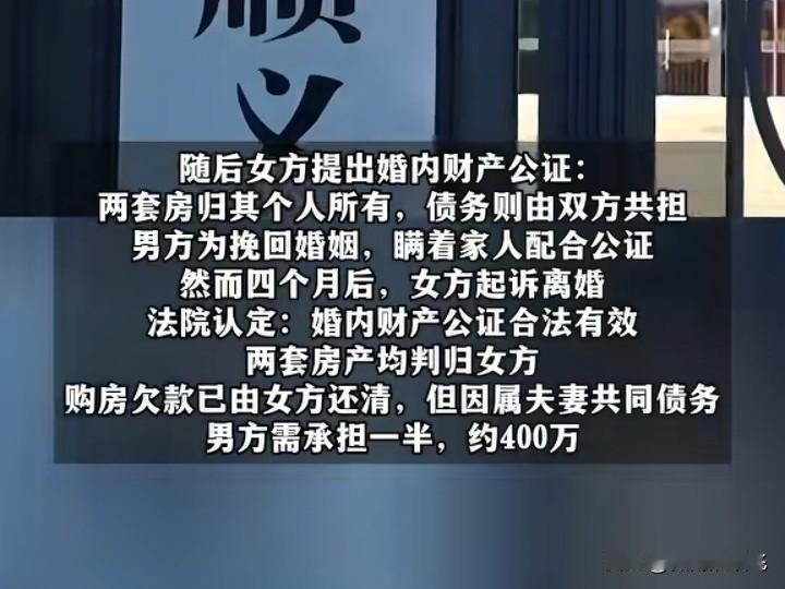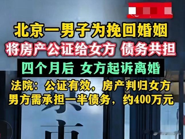 巴菲特说:选择另一半是你最大的投资。这句话,现在具象化了。 话说,北京一男子,诚诚恳恳投资婚姻,谁料,9年后,不但北京的2套房子没了,还倒背400万外债,年迈的父母和他,面临无房居住的困境。 男子王先生,2013年在北京贷款购买了第一套房子,房子装修后,他把父母从老家都接到北京一起居住。 2016年,王某遇到了生命中的另一半张女士,两颗年轻的心亲密连接在一起,然后顺理成章地欢欢喜喜步入婚姻殿堂。 婚后,刚开始,这对年轻夫妻和王先生的父母共同生活。 但没多久,张女士觉得和老人住在一起不方便。 于是,夫妻商量沟通后,决定去朝阳区再购买一套房子,他们夫妻搬出去住。 因为当时手头并不宽裕,王先生的第二套房子是以高额利息,从第三方取得贷款购买的。 所以,后面,王先生夫妻虽然搬去了新房和老人分开住,但是夫妻之间的矛盾和争吵还是没减少,反而随着每个月房贷压力过大,夫妻间的争吵愈演愈烈,甚至发展到要离婚的地步。 可是,不管日常怎么吵闹,王先生还是很在乎张女士。 他舍不得和妻子分手,于是放低姿态,答应了张女士提出的一些看似不合理的要求。 张女士提出,不离婚,就把王先生名下的两套房产,都公证处公证归她个人所有,但家庭债务,王先生要共同负担一半。 就这样,王先生为了挽救自己的婚姻,瞒着家中的老父母,把两套房子都公证给了张女士。 他私下自以为,满足了张女士的要求,给足了她安全感,张女士会安心和他一起共创美好婚姻。 可谁料,张女士拿到房子的4个月后。 她一纸诉讼,递交到法院申请离婚,并且还要求王先生完成共同负担债务的协议。 而之后,法院的判决来了。王先生的两套房子独属于张女士,虽然张女士已经还清了两套房子的贷款,但共同债务一半的400万,应该由王先生承担。 那么9年婚姻,王先生得到了什么? 他除了当了一个女人9年的老公,好像什么都没得到。 反而,他还把婚前的一套房和婚后的另一套房都整没了。 更可悲的是,房子没了还不算什么,他还倒背银行400万外债。 现在,张女士拿着法院的判决书要求王先生腾房。 可怜王先生的老父母,在北京居住了十年的房子,再也不属于他们遮风挡雨的归宿。 如果强制执行,王先生和父母即将失去住所,他们三个要么租房住,要么父母只能回老家了。 实在话,对于婚姻,不管是投资也好,还是经营也罢。 最基本的条件,就是婚姻中的男女都需要坦诚,是心在一起,劲往一处,才能越过越好。 一旦某一方有了离去的念头,那再怎么低姿态,再怎么用钱财给予安全感,那都是一场谋算而已。 素材来源网络——华商报,侵删 巴菲特投资金句
