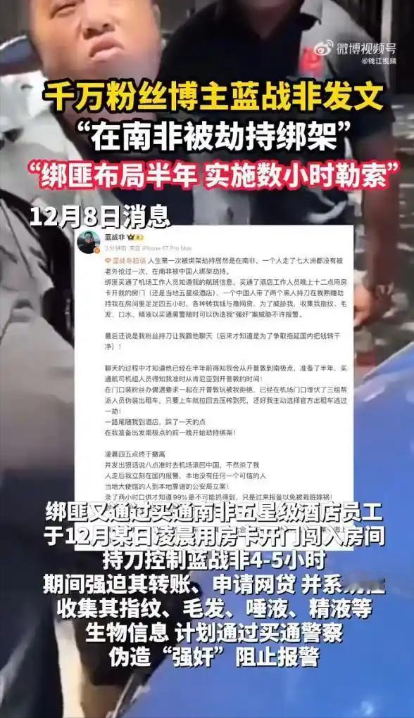 千万网红蓝战非遭南非绑架!否认自导自演,细节惊悚全网炸锅 千万粉丝网红蓝战非南非遭绑架事件持续发酵!继12月8日自曝在开普敦五星级酒店被持刀劫持后,面对“仙人跳”“自导自演炒作”的质疑,他于9日强硬回应:“我不要同情,但别无故猜忌造谣!” 一波三折的剧情,惊悚到让人头皮发麻的细节,彻底引爆全网讨论。 据蓝战非爆料,这场绑架绝非临时起意——绑匪提前半年布局,买通机场、酒店人员精准掌握他的行程。事发时,1名中国籍男子伙同2名黑人持刀闯入房间,将他劫持长达四五小时。对方不仅索要300万赎金,逼迫他转账、申请网贷,更丧心病狂地拍摄裸照、逼签欠款文件,甚至收集他的指纹、毛发等生物信息,企图伪造“强奸案”,断他报警后路。 万幸的是,蓝战非凭借警惕心躲过一劫:他拒绝了绑匪安排的车辆,坚持选择官方出租车,才没落入更深陷阱。脱险后他死死顶住房门到次日清晨,在中国驻当地使馆安保接应下转移至安全屋,期间因压力过大当场崩溃大哭的画面,让不少粉丝心疼不已。 可事件曝光后,舆论瞬间分裂。有人怒斥绑匪嚣张,为他的遭遇愤怒;也有网友质疑“细节太戏剧化”“像剧本”,再加上他过往有争议经历,“仙人跳”“自导自演”的猜测愈演愈烈。更关键的是,他最初的爆料动态已被删除,更让质疑声雪上加霜。 对此蓝战非明确否认,强调南非警方已立案调查,正调取监控取证。他坦言,当地绑架案破案率极低,报案并非指望能抓到凶手,而是怕被绑匪反咬栽赃。目前平台已证实他安全回国,中国驻开普敦总领馆也启动了领事保护机制。 一边是细思极恐的绑架细节,一边是铺天盖地的质疑,真相到底如何?坐等调查结果出炉! 蓝战非否认自导自演 网红南非遭绑架细节