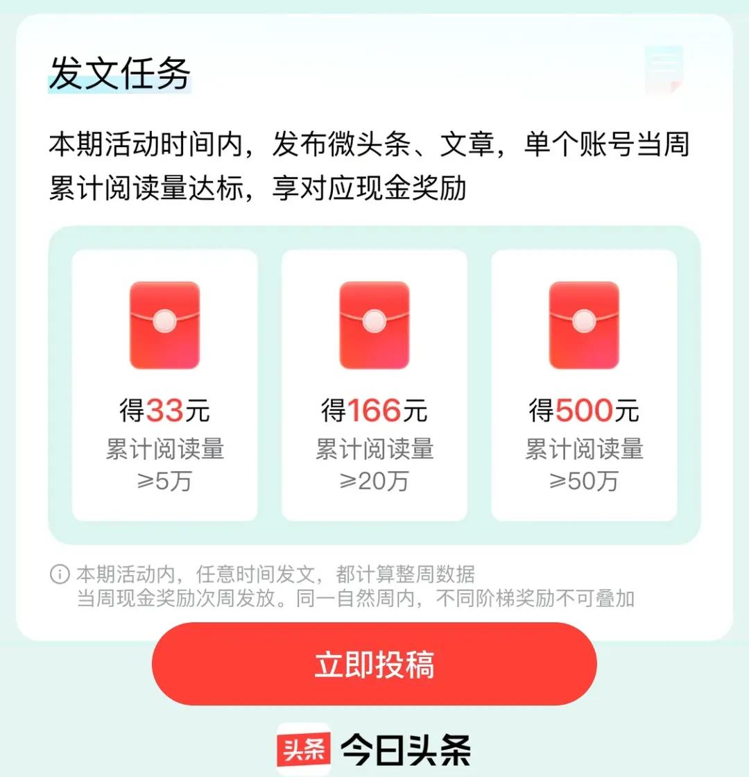 白拿33块钱! 我一天几千阅读的小白,何德何能,能得到今日头条官方的任务通知。 一周内发文的阅读量超过5万,就能额外领到33元奖金。 阅读量超过20万能拿到166元奖金 超过40万直接拿到500块。 这是除了日常的收益之外的奖金,说起来不算少 如果每周的阅读量达到40万,这份收益是相当可以的。 今天已经是周二了,已经是第2天了,我的总阅读量刚刚有2万左右 这周的5万阅读量应该有希望,20万估计就不太可能了。 但是如果能拿到33块钱的奖金,也可以了,至少这一周的菜钱是完全没问题的。 知足常乐! 头条给了钱就放心收下。 持续创作,持续输出,有朝一日,希望自己也能够坐稳头部!