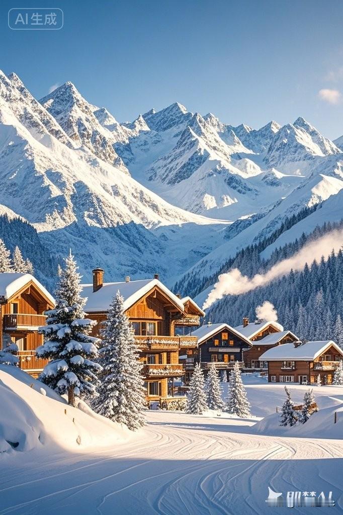 冬日暖阳下,木屋与雪山相映成趣,宛如童话世界。冬日雪景氛围照 靓丽雪景 雪景随手拍 下雪时拍照巨美