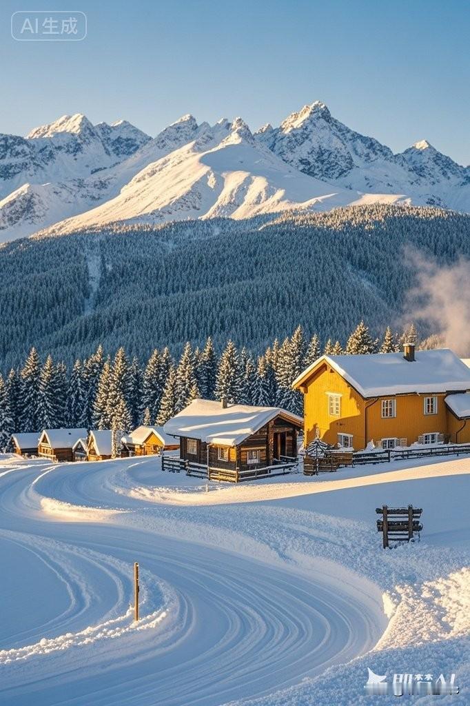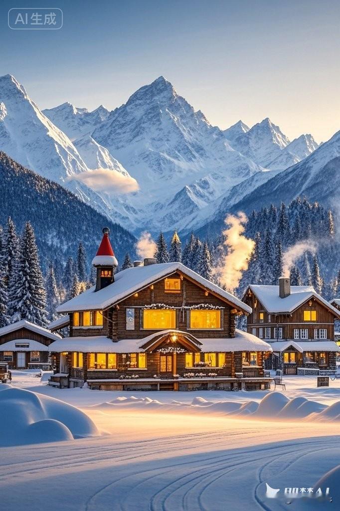 冬日暖阳下,木屋与雪山相映成趣,宛如童话世界。冬日雪景氛围照靓丽雪景雪景随手