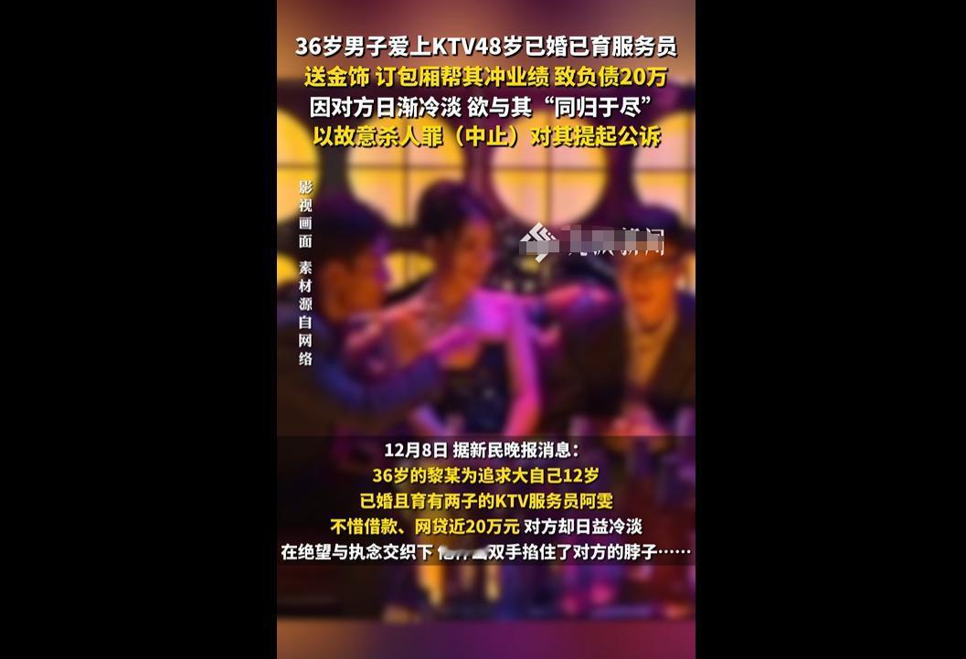 上海 36 岁男子黎某,十几年没谈恋爱,在 KTV 认识已婚且有两娃的服务员文某后,明知对方情况仍疯狂追求:买黄金首饰、帮订包间赚提成,工资不够就借钱、网贷,3 个月欠了 20 万。 文某对他冷淡,黎某竟想同归于尽,趁文某点歌时掐晕她,幸被 KTV 工作人员及时介入。 近日,黎某因故意杀人罪(中止)被宝山检察院公诉,网友批其执念病态。 黎某这 “恋爱脑” 简直是走火入魔! 十几年没谈恋爱,一碰到人就跟丢了魂似的,明知人已婚有娃,还砸钱当 “冤大头”,工资花光借网贷,欠 20 万都没刹住车,这哪是追爱,分明是给钱包 “放血” 还附赠牢狱风险! 更离谱的是,人不理他就想掐晕同归于尽,这哪是痴情,是没脑子还缺德! 感情又不是买东西,砸钱就能到手?人家有家庭还硬凑,纯属没边界感的 “自我感动式作死”! 还好没酿大祸,不然牢饭得吃够! 也给大伙提个醒:追爱先看清楚对象,别在错的人身上瞎烧钱,不然钱没了还得蹲局子,这亏本买卖可别做!