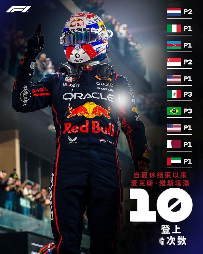 自荷兰站开始,维斯塔潘连续10场比赛登上领奖台,其中6站拿到冠军,亚军和季军各拿到2次。