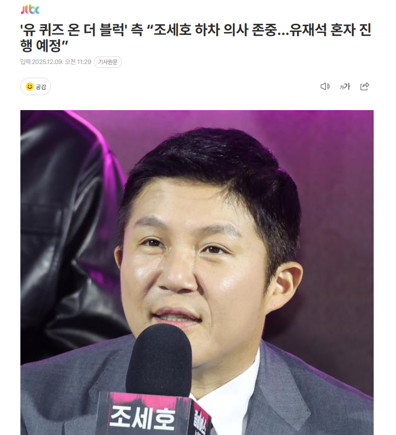 【《You Quiz On The Block》制作方回应“尊重曹世镐下车决定…由刘在石独自主持”】海外新鲜事热点现场 tvN综艺节目《You Quiz On The Block》制作方于9日表示,由于曹世镐下车,节目将由刘在石一人主持。《You Quiz On The Block》制作方表示:“我们一直密切关注近期与曹世镐相关的事件。《You Quiz On The Block》尊重曹世镐经过深思熟虑后提出的下车意愿,从今后的录制起,曹世镐将不再参与本节目制作。”制作方同时说明:“目前已录制完成的未来两周节目将按原计划播出。而本周的录制因与已确定出演的嘉宾有约在先难以取消,因此将按计划进行,但会改为刘在石一人主持。”近期身陷与黑社会组织牵连疑云的曹世镐,已于当日向正在出演的综艺节目表明了下车意向。曹世镐表示:“我过去因各地活动需要,结识了一些从前不认识的各种各样的人。作为公众人物,本应对周围的人际关系更加慎重,但当时因心智尚不成熟,未能妥善处理这些人际往来。我正在深刻反省。”