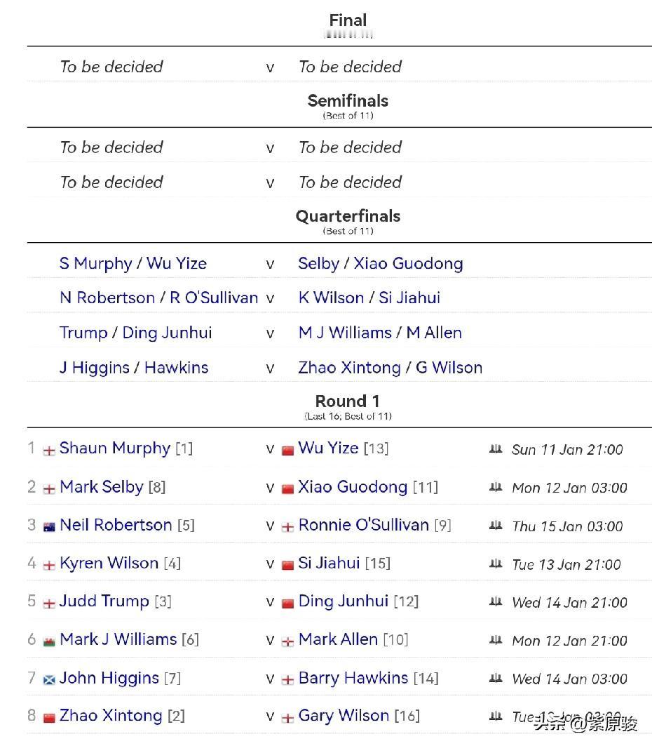 斯诺克大师赛抽签已经结束了,对争取获得大满贯的赵心童来说,抽签结果固然重要,但也不是那么重要,反正今年的目标只有一个,那就是夺冠。只有夺冠才能完成大满贯的目标。 赵心童分在下半区,第一轮对加里·威尔逊,如果获胜,第二轮将对希金斯和霍金斯之间的胜者。如果再进一步,则可能遇到特鲁姆普、马威、艾伦和丁主任之间一位。 不过个人认为,跟上半区有凯伦·威尔逊、塞尔比、墨菲相比,下半区相对还好打一点。 作为斯诺克三大赛之一,大师赛虽然是邀请赛,但奖金高,能获得大师赛冠军,也是巨大的荣誉,而对力争获得大满贯的赵心童来说,意义更加重要。大满贯球员身上别着的皇冠标志,对斯诺克球员来说是一项莫大的荣誉。 中国球员丁俊晖和颜丙涛都拿过大师赛冠军,这次中国5名球员获得大师赛参赛资格,我们希望他们中的一人能走到最后,当然最希望的是赵心童。