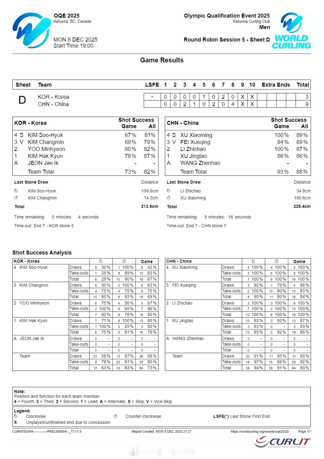【冰壶冬奥落选赛中国男队9-3大胜韩国 提前两轮锁定前三】中国冰壶男队9比3韩国 中国冰壶男队5连胜 12月8日加拿大基洛纳,冰壶冬奥落选赛中国男队第五场9-3大胜韩国,提前两局让对手认负。目前中国队五战全胜提前两轮锁定前三争夺奥运席位的资格。本场中国队四垒徐晓明和二垒李智超的成功率均为100%!北京时间10日凌晨6时,中国队将对阵波兰。