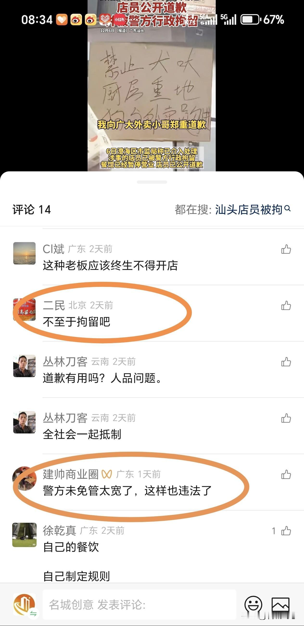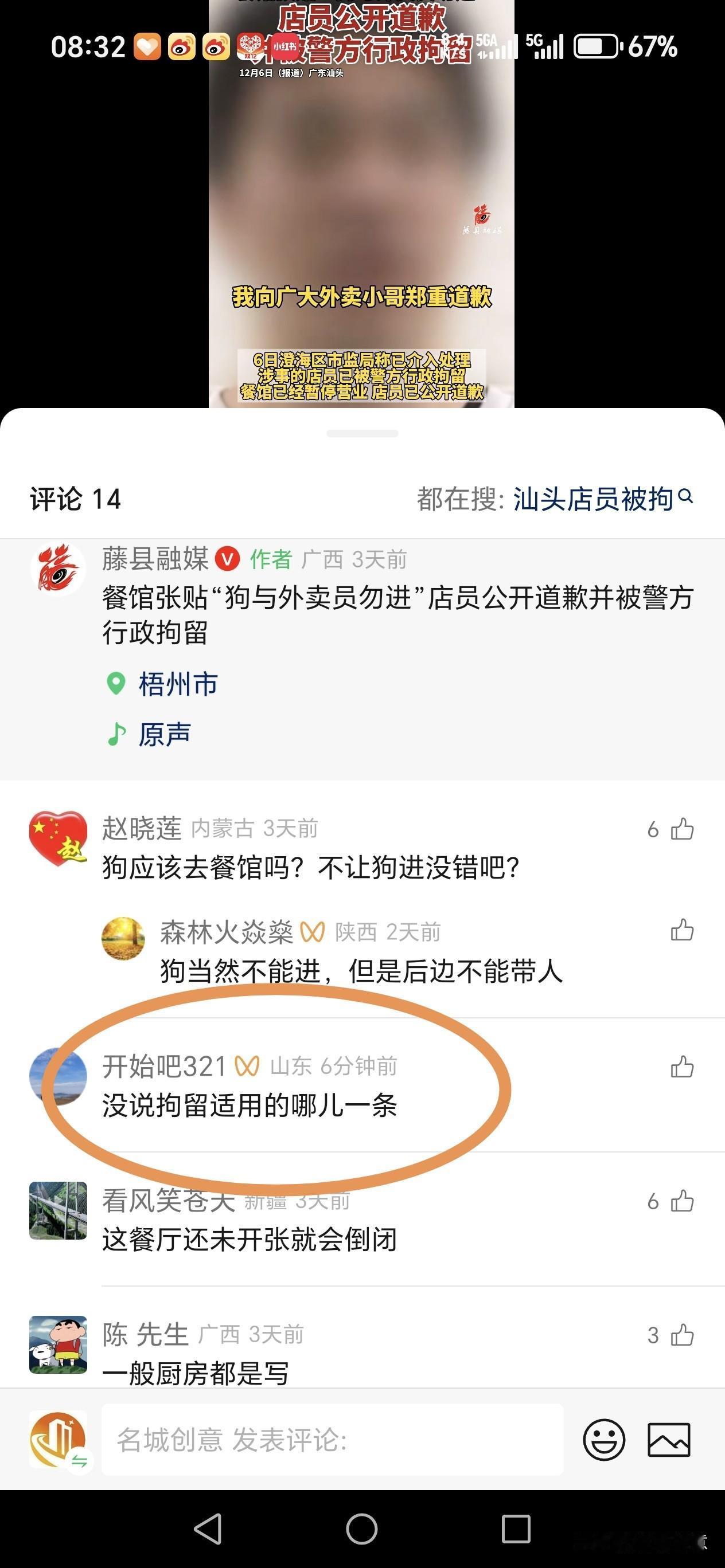 汕头警方对张贴“禁止犬吠,厨房重地狗与外卖员勿进”告示的店员行政拘留的法律依据是《中华人民共和国治安管理处罚法》第五十条,该条款明确,公然侮辱他人的,可处五日以下拘留或者五百元以下罚款;情节较重的,处五日以上十日以下拘留,可以并处五百元以下罚款。涉事店员张贴的告示将外卖员与狗并列,属于对这一特定职业群体的公然侮辱,严重侵害了外卖员的人格尊严,警方据此作出行政拘留处罚符合法律规定。 你会给外卖员道谢吗 餐馆贴狗与外卖员勿进 官方通报
