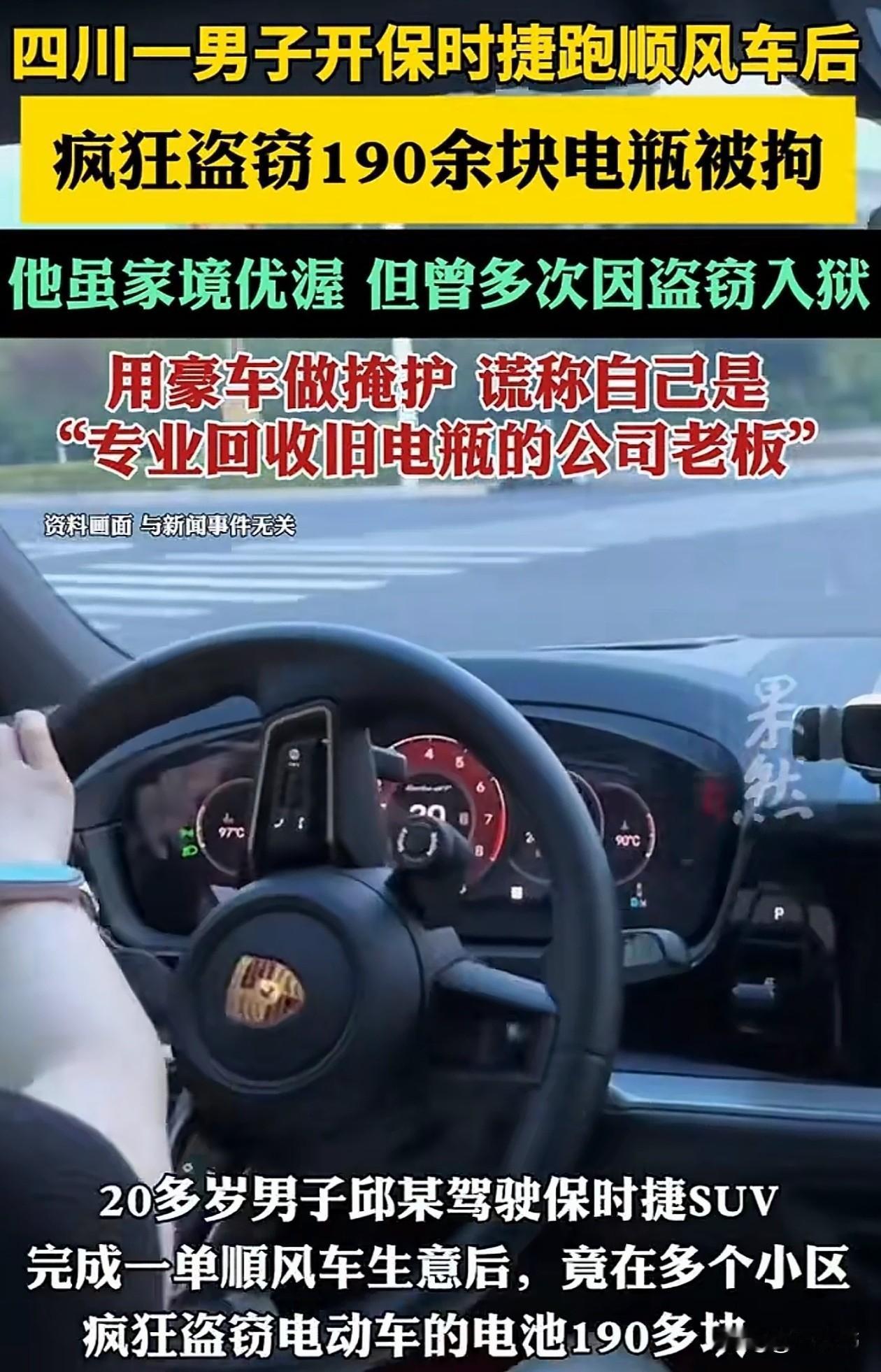 这是啥心理?四川资阳,男子开保时捷跑顺风车,跑到一个小区附近,竟然把车一停,进进出出偷了190多块电瓶,被保洁阿姨当场识破。网友:“骑白马的不一定是王子!” 当时小区里一位保洁员起大早打扫卫生,发现这个小伙骑个共享单车,前门进,后门出,来回晃悠好几趟,车筐里还总装着沉甸甸的东西,明明没下雨,还特意用雨衣盖着,一看就形迹可疑啊。 于是阿姨就找到保安,两个人过去一看,发现这小伙偷了不少电瓶,正往保时捷车的后备箱搬。保安想上前阻拦,奈何小伙先一步启动车子,逃之大吉了。 可逃得了初一,逃不过十五呀,最后小伙还是被警方抓获了。 警方一查,发现这小伙更了不得,他之前就因为老偷东西进去过,这次好不容易出来了,父母希望他能洗心革面,变卖家产买了个二手保时捷,就希望他能好好做个司机。 可没想到小伙瘾实在是大,放着好好的营生不干,又偷起了电瓶,还谎称自己是专业收电瓶的公司老板,真是又好气又好笑。 有人说,他是开着有面子的车做没面子的事情。 也有人说,不想干直接买了车也比偷电瓶强啊。 还有人说,保时捷算不算作案工具。 都说江山易改,本性难移,有些人吧做这种事可能并不是因为缺钱,就是一这么做他就感觉很满足。这种畸形的心理,是不管多么好的物质条件都改变不了的。唯一可怜的就是他的父母,真是操碎了心还没什么用!