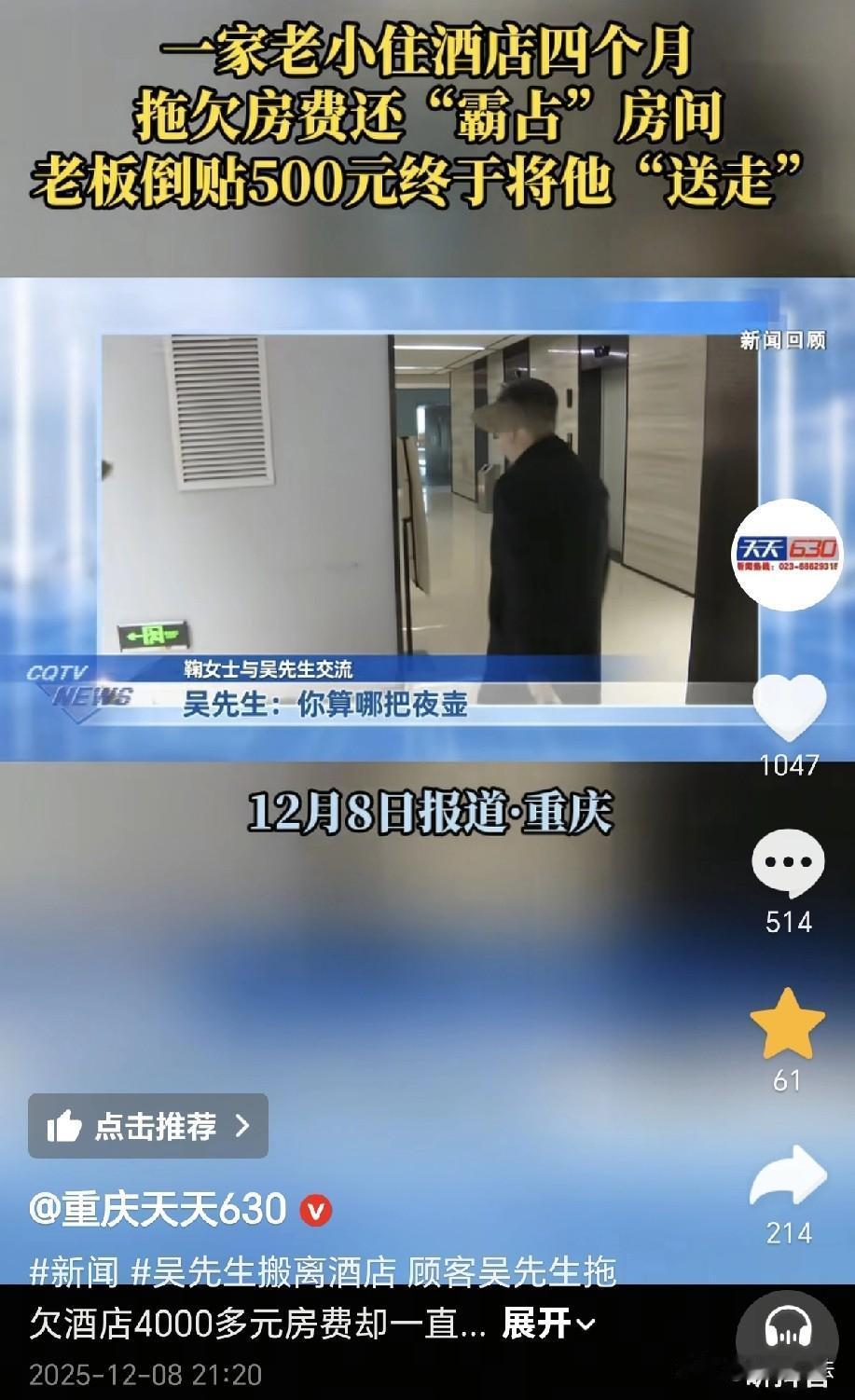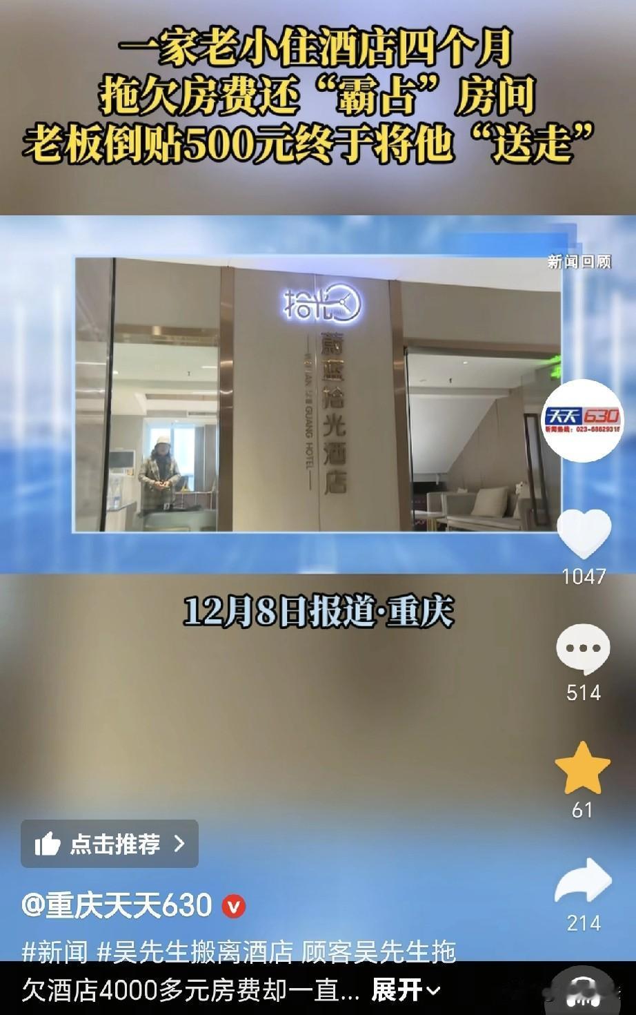 脸都不要了!重庆,一男子带80岁母亲和10岁孩子入住酒店,房费每天140元,开始他正常交,没过多久,他不交了,他住4个月,欠房费4153元,老板要钱,他说没有,既不交钱也不搬走,断电断水,他依旧坚守,老板提出,只要他搬走,房费不要了,再给他500元搬家费,男子拒绝: 你算哪把夜壶?我就不搬,你去起诉! 鞠女士遇到一个奇葩的顾客,在她开酒的生涯里,从未遇到过这样的事情。 一位客户,在她酒店里住了4个月之久, 可是客户拖欠房费4153元,就是不给,鞠女士忍无可忍,立刻要他搬离酒店。 谁知客户既不给钱,也不搬走,鞠女士气的想哭,哪有这样欺负人的! 原来,今年7月31号,鞠女士的酒店里来了一位特殊的客人。 客人姓吴,他拖家带口,带着80岁的老母亲,和一个10岁的孩子。 鞠女士连忙上前接待,吴先生表示,他要处理一些事情,需要在这里进行长期的入住。 双方约好,每天房费140元,吴先生立刻办理了入住手续。 奇怪的是,他们住到10月7日,吴先生都按时支付房费,10月7号之后,吴先生突然不再缴房费了。 鞠女士每次要钱,吴先生都说他很多钱没要回来,现在没钱支付房费。 鞠女士有点生气,我是做生意的,你这样做,我的酒店怎么维持? 鞠女士又想,不如把他的东西往外一扔,再把房门一锁,赶出去拉倒。 可是,鞠女士看到吴先生80岁的老母亲和10岁的孩子,她又于心不忍,做不出来决绝的事情。 鞠女士劝自己体谅,对方不支付房费,肯定也有他的难处,可是就这样一次次宽限,拖欠的房费就越积越多。 到了11月底,累计欠费已经涨到了4153元,鞠女士忍无可忍,这样下去,酒店还咋做生意? 鞠女士提出,让吴先生搬走,另找住处, 谁知吴先生拒绝,他说住在这里方便,他就不走,也不支付房费。 鞠女士没有办法,11月27日,在吴先生住的房间门上张贴了解除服务的告知函。 可尽管如此,一家3口,依旧赖着不走,也不说理由,他们每次出门,都会留下一个人在房间里值守。 酒店一气之下,不给这间房子缴纳水电,房间里没水没电,他们依旧坚守在里面。 鞠女士又找吴先生说,你只要搬走,之前的房费我给你全免,也就是说,拖欠的房费我不要了。 另外,我再给你出500元搬家费,只要你搬走,我负责给你找人搬东西。 可吴先生还是拒绝,他压根不理,每天照样住着不走,他耍起无赖,我看你能把我咋样? 鞠女士多次上门沟通,你有困难时,我给你解决了问题,如今这房子没水没电,你们住着,我也怕出什么问题,我请求你们离开。 可是吴先生置若罔闻,毫不为所动,鞠女士没有办法,只有找来记者帮助。 记者来到房间,遇到吴先生的母亲,老太太立刻关门上锁,还大声斥喝,你有什么权利来管这件事情! 随后,记者一直等待,一直到吴先生回来,吴先生看到记者,感觉有些意外。 他向记者解释,自己之所以住在这里,只是为了一件官司还没有解决,他没有钱支付房费。 因为他打官司的对方,欠了他十几万元不给,他说他会在这个月的中旬或者上旬就会把房费的问题给处理掉。 吴先生还说,自己一家三口住在这里,并不是不愿意给钱,鞠女士没有权利将自己一家赶走。 自己住在这里,是因为自己没有房子,他在这里,就是因为这里离法院很近,他办起事来方便。 至于鞠女士索要房费,那就是经济纠纷,他要鞠女士到法院去起诉他要钱。 鞠女士追着他说,你只要今天搬走,以前的钱我都不要了,我还倒贴你500元搬家费,我帮你搬家,给你出人。 谁知吴先生翻脸,还出口不逊,说他就是不走,鞠女士算是哪把夜壶? 记者将新闻报道了出来,一时之间,舆论扑面而来,大概是吴先生受不了谴责了,当天晚上,便开始收拾东西。 鞠女士信守承诺,拿出500元给了吴先生的母亲,他们接过钱后,立刻搬走了行李。 鞠女士带人进去一看,屋子里乱的不能下脚,满屋子都是怪味,卫生间里已经不能看了。 工作人员表示,要想彻底打扫干净,去除味道,大概需要两三天的时间。 鞠女士非常高兴,大概是吴先生看到了新闻,感受到了压力,这才主动搬离了出去。 鞠女士与人为善,可是她的善心,却被人辜负,一间客房被长期占用四个月,意味着错失了无数潜在的客源。 再加上水电、人工成本,鞠女士的损失早已超出欠款本身。 《民法典》第722条规定: 承租人无正当理由未支付或者迟延支付租金的,出租人可以请求承租人在合理期限内支付;承租人逾期不支付的,出租人可以解除合同。 吴先生长期入住酒店,无正当理由拖欠房费4153元,经酒店多次催缴仍拒不支付,已符合法定违约情形。 如果鞠女士追究,酒店可通过诉讼要求其支付欠款、承担房屋占用及清洁损失并强制腾退。 世界之大,无奇不有,这位吴先生的的所作所为,令人大开了眼界。 关注@王哥说法 多学法律少吃亏! 信源: 重庆天天360