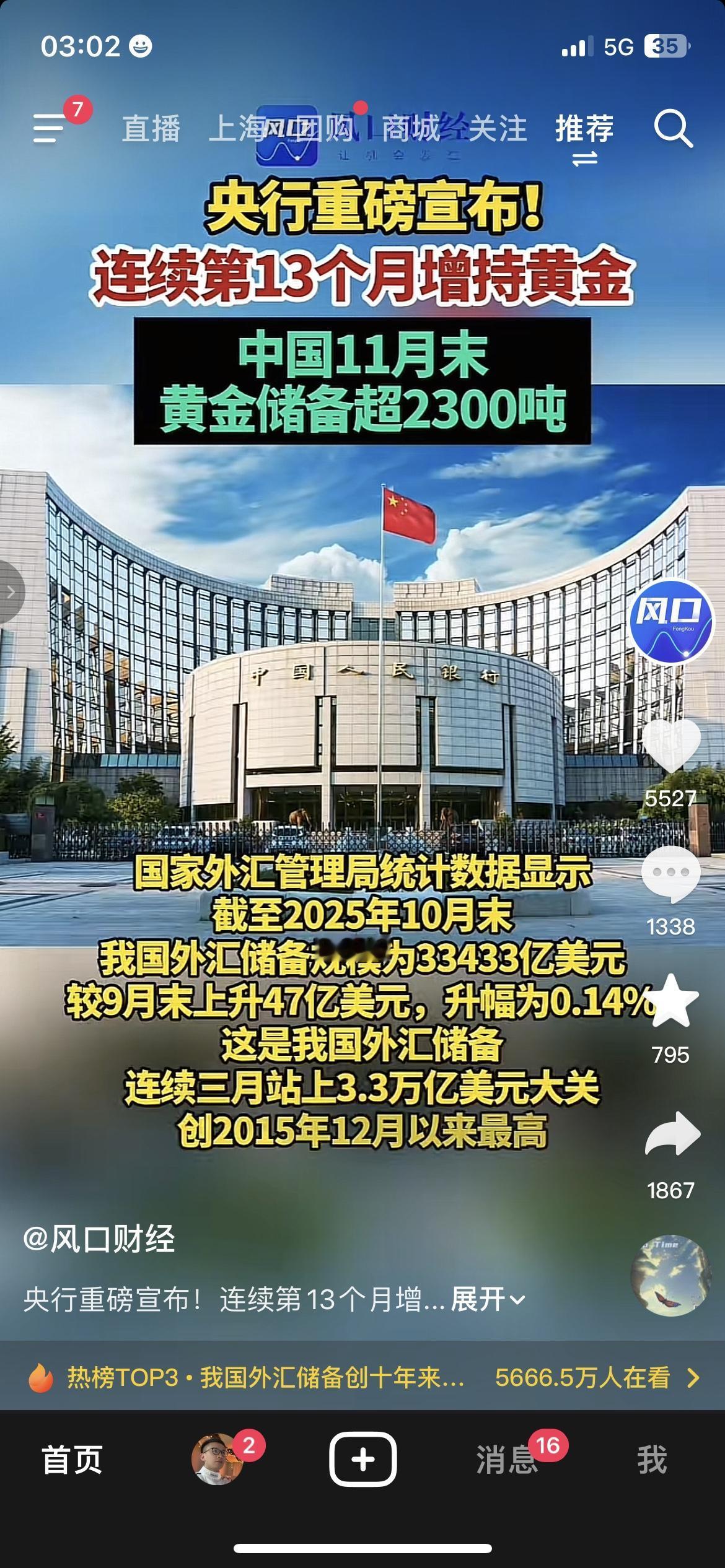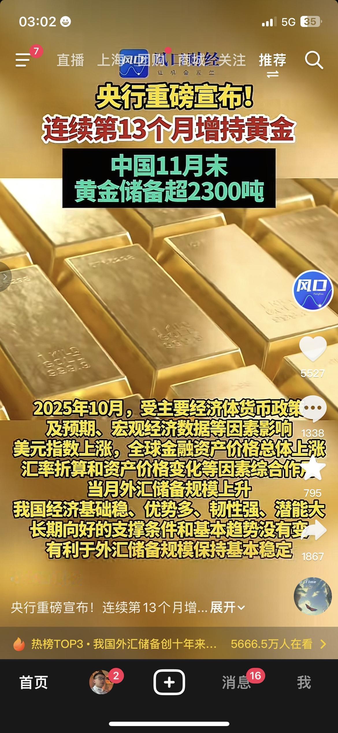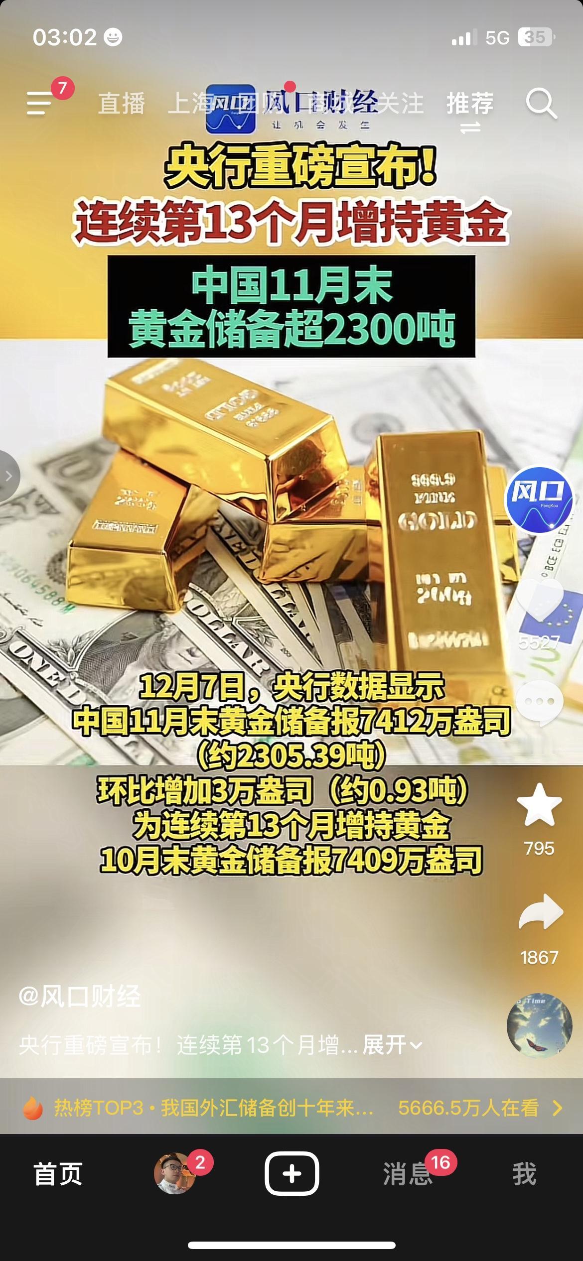 央行又“囤黄金”了!连续13个月加仓,11月末储备直接破2300吨,这信号不一般 刚刷到央行最新数据,直接愣了——咱们11月末的黄金储备突破2300吨了!而且这是连续第13个月增持,相当于每个月都在“悄悄囤黄金”。 具体数给你们扒清楚:11月末黄金储备7412万盎司(约2305.39吨),比10月又加了3万盎司(约0.93吨);顺带提一嘴外汇储备,10月末直接干到33433亿美元,连续三个月稳在3.3万亿以上,还是2015年12月以来的最高值。 为啥央行总囤黄金?其实很好懂——现在全球经济波动多,黄金是“硬通货里的硬通货”,囤得越多,抗风险的底气就越足。咱们普通人可能没法像央行一样囤吨级黄金,但这连续13个月的增持节奏,是不是也能给咱们的资产配置提个醒? 你们觉得这波“囤金”,普通人能跟着沾点啥好处不?评论区说说你的看法~黄金持仓量 黄金储备政策 黄金持仓量
