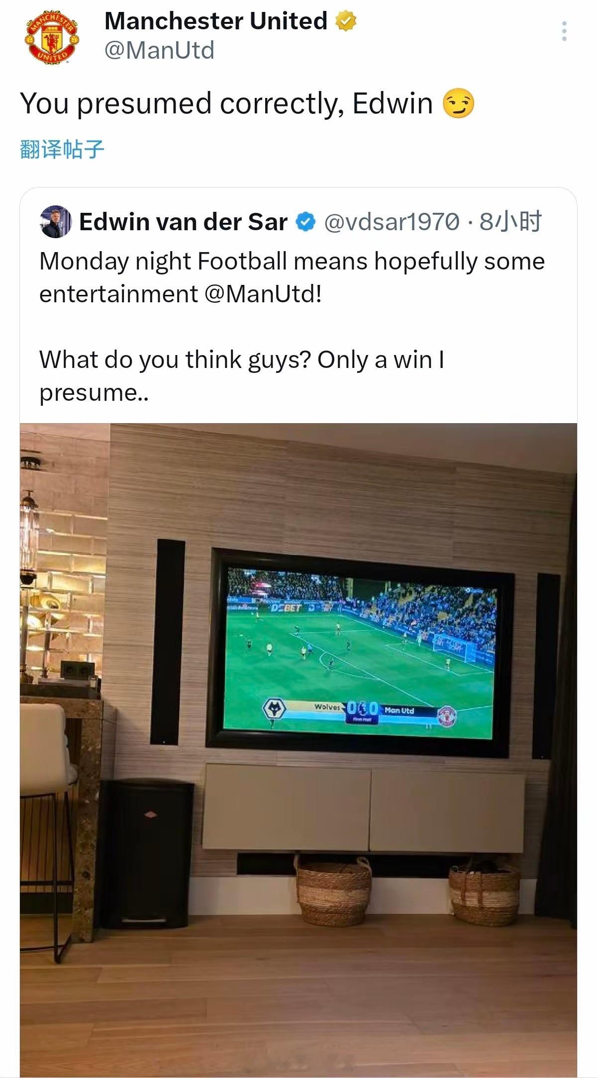 曼联名宿范德萨在社媒晒出自己在家观看曼联客场迎战狼队的比赛直播并配文:“周一晚的足球赛,希望曼联能带来些精彩表现!”曼联官方在赛后回复:“你的猜测没错哦,埃德温😜”