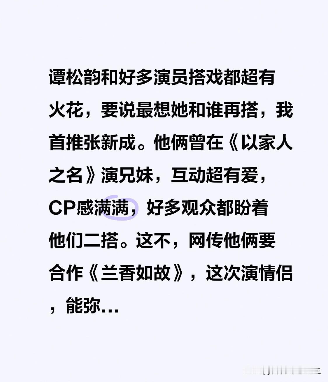 谭松韵和好多演员搭戏都超有火花,要说最想她和谁再搭,我首推张新成。他俩曾在《以家人之名》演兄妹,互动超有爱,CP感满满,好多观众都盼着他们二搭。 这不,网传他俩要合作《兰香如故》,这次演情侣,能弥补之前剧里的遗憾。这部剧改编自《兰香缘》,有朝堂权谋、家族恩怨等元素。不过,剧版选角有争议,最初男主想找丁禹兮,宋威龙也被溜过。而且消息没官宣,大家既期待又怕落空。真希望能成真,想看他们再续前缘! 谭松韵 谭松韵演技派 明星 [烟花][烟花][烟花]