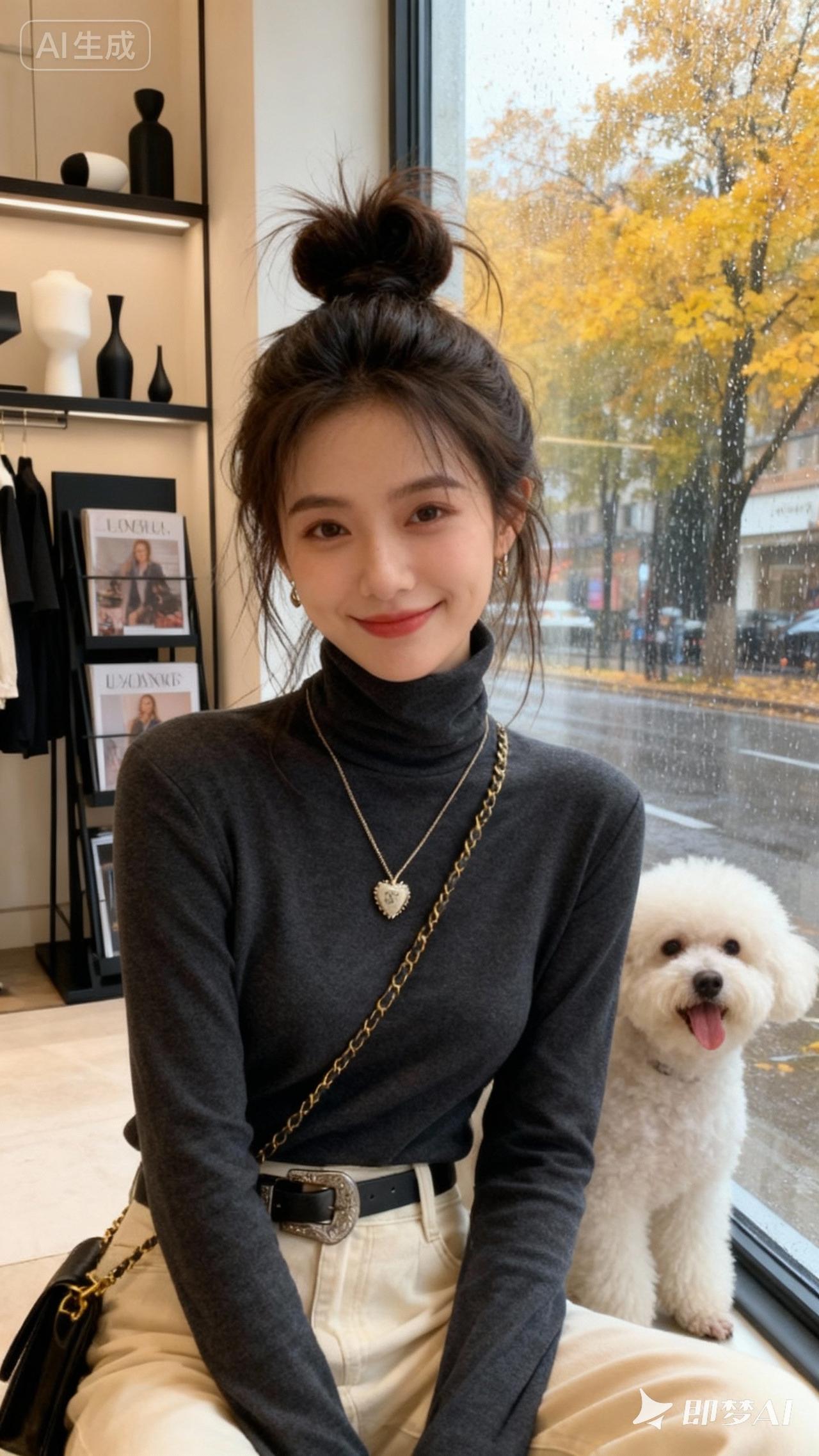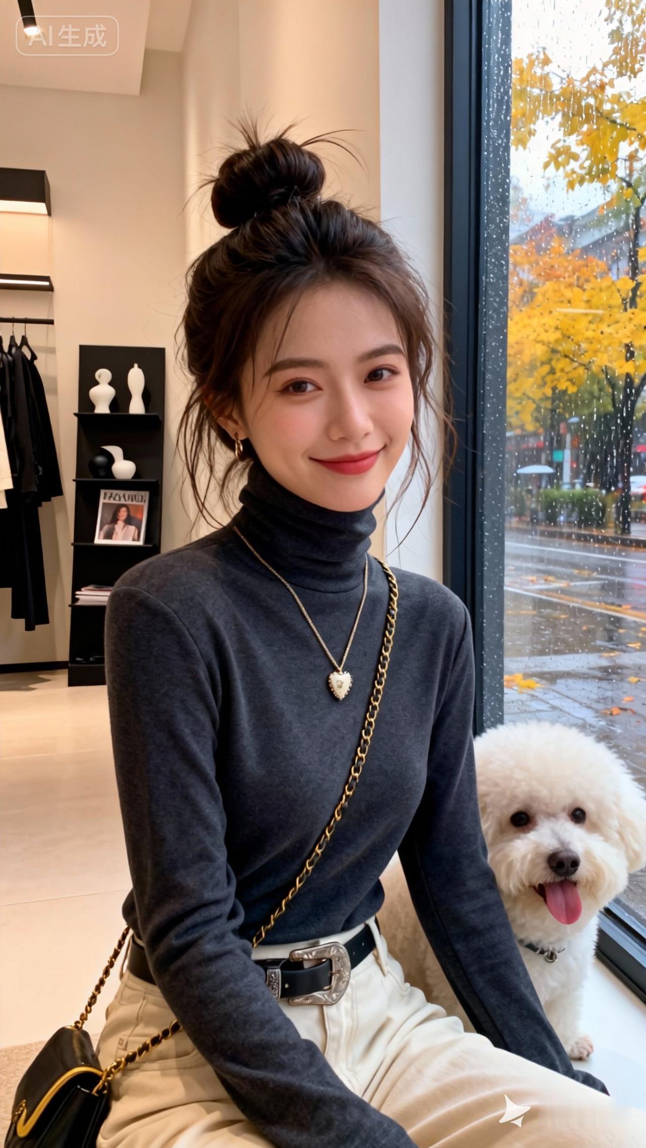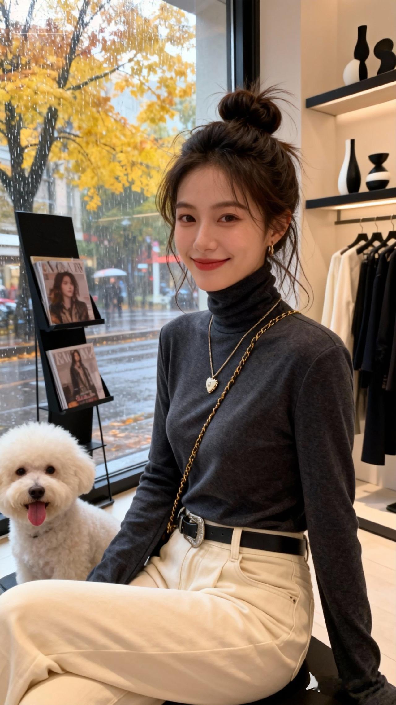 一位年轻女性,头发高高盘成丸子头,发丝自然散落几缕碎发,增添随性氛围;五官精致,眉眼柔和,眼妆清淡,唇色自然,呈现出放松的神态, 身穿图中同款衣服,注意服装款式细节 坐在装饰摆有黑色杂志架与简约黑白色摆件的服装店室内看向窗外,后面还有一条吐舌to头比熊犬,窗外是秋雨濛濛、黄叶满树的街景,整体画面呈现出高级感与时尚氛围,看向镜头微微一笑