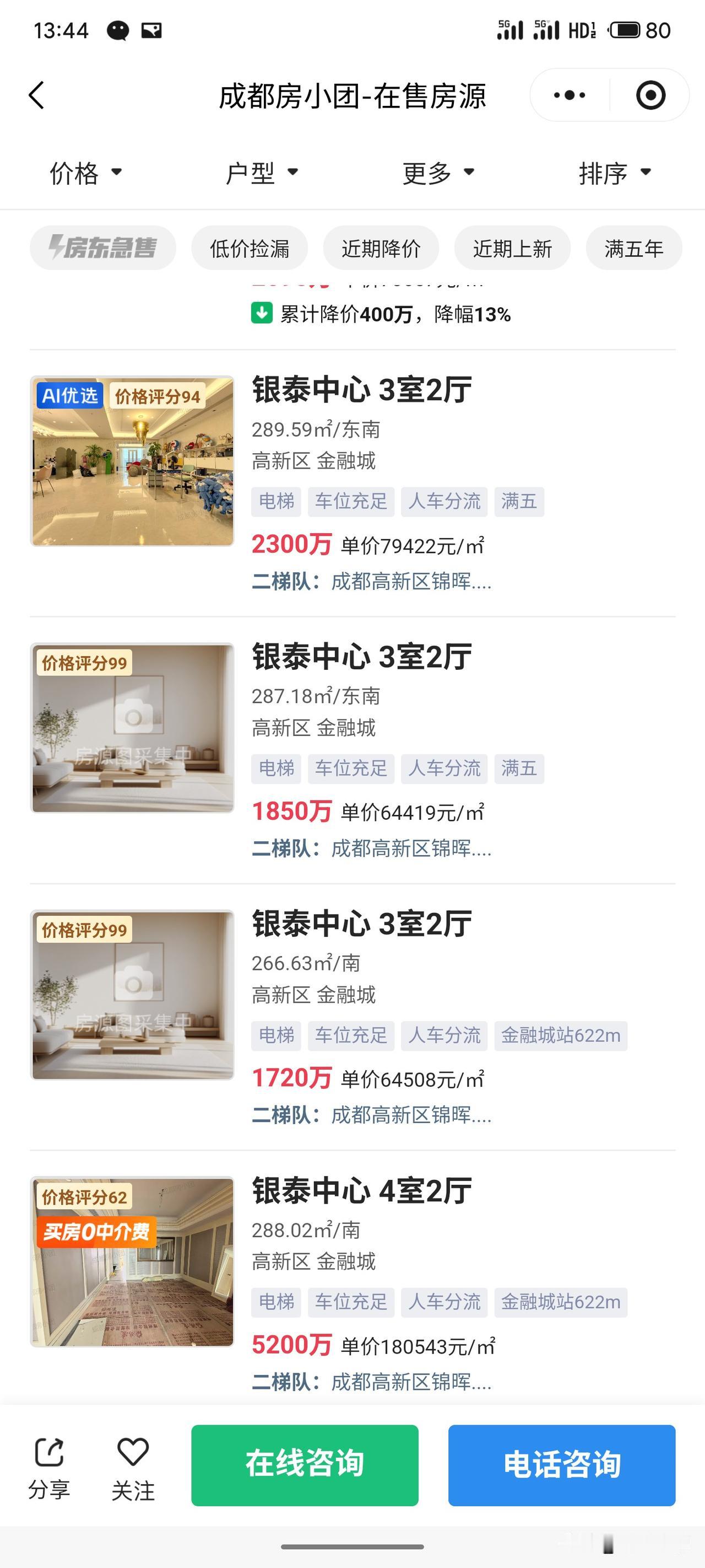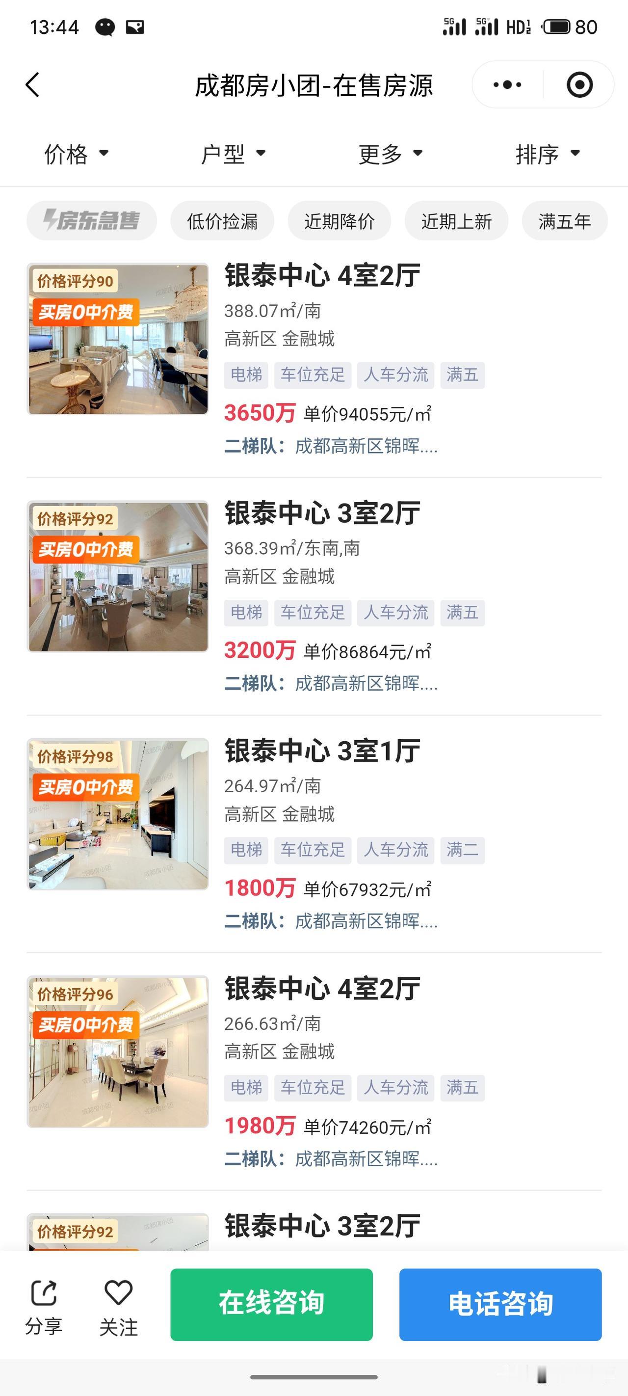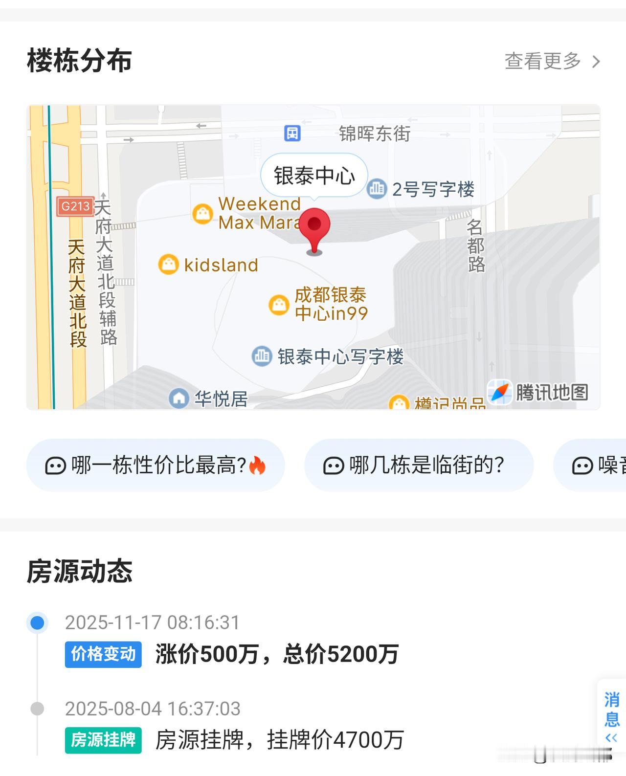 现在成都二手房报价最高的房子位于武侯区的银泰中心,单价竟然超过了18万/平,建面288.02平,总价5200万!房子8月3号挂牌还是4700万,竟然不降反升500万,不知道哪儿来的底气,还是只是为了挂着而挂着,有点迷糊了! 看了一下银泰中心挂牌的其他房子,单价最低的6.4万/平,高一点的10万多/平,这套挂牌18万+,真有人买吗? 只能说有钱人的世界太玄幻,好难懂啊!辛辛苦苦一整年,还买不到一平[捂脸]