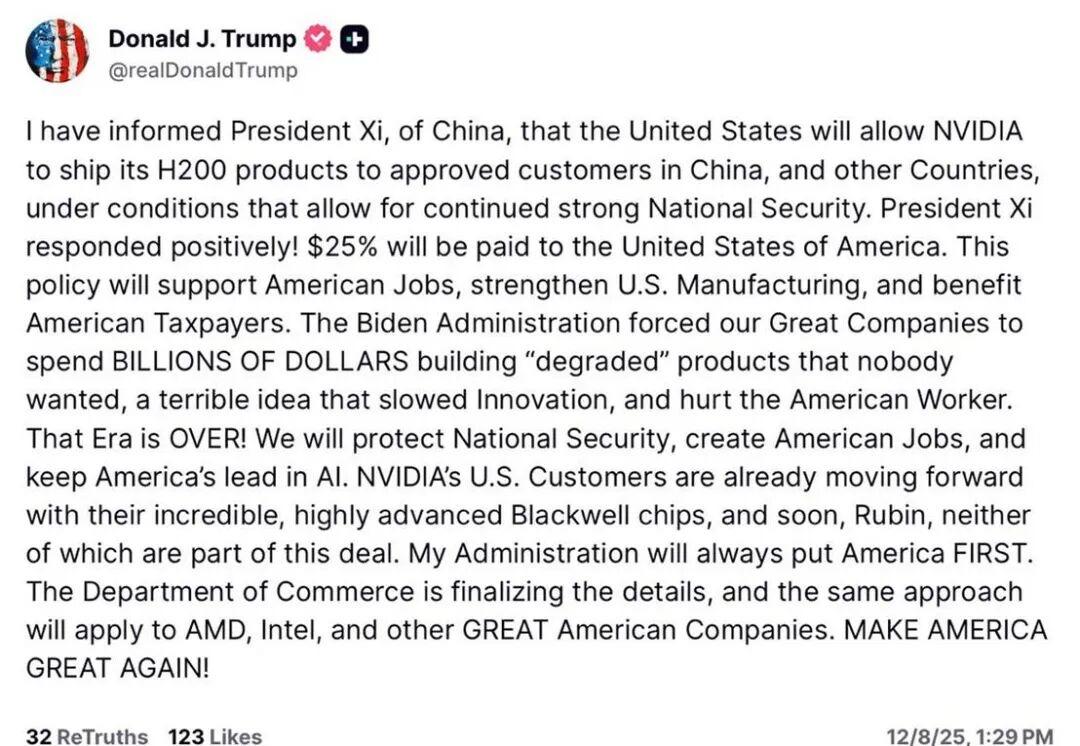 特朗普还宣布,将允许英伟达将H200芯片卖给得到批准的中国等国客户。这是白宫在对华出口管制问题上出台的折中方案,允许对华出口性能大约比其最先进产品落后18个月的强力英伟达GPU。这基本上相当于美国在先进芯片出口管制政策上的一次逆转,可能会对人工智能竞争产生决定性影响。算力是美国的主要优势;而中国在电力、工程师以及整个边缘层面都更强。白宫内部的一些人认为,拜登政府时期的对华芯片出口限制或多或少已经失败。 图片来源于网络