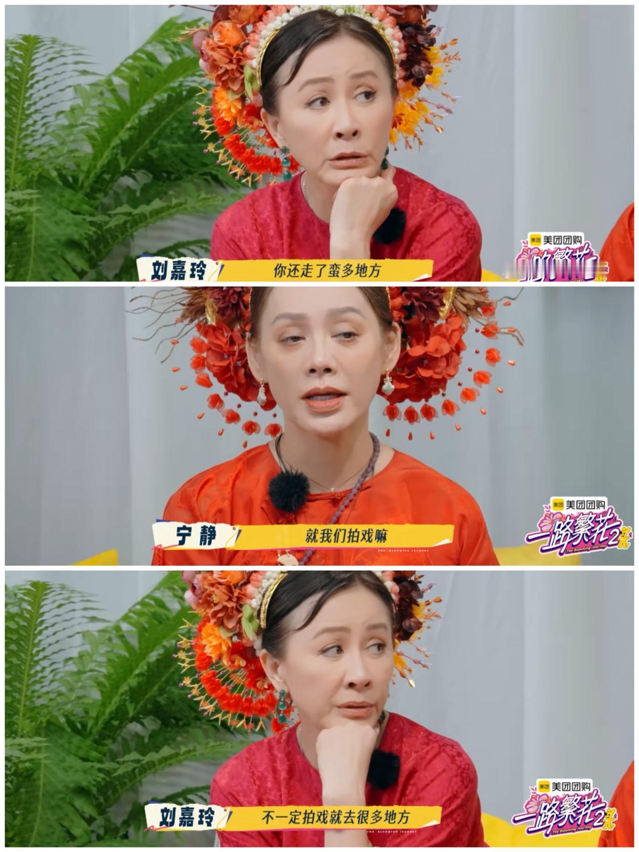 刘嘉玲听到宁静厦门鼓浪屿经历, 满是不解, 宁静吞吞吐吐。 刘嘉玲和宁静一起在泉州录节目, 看到泉州建筑, 就问身边的宁静是否 在厦门鼓浪屿见过类似的建筑风格。 宁静年轻时去过, 但是当下记得不清楚了, 无法回答刘嘉玲的问题。 刘嘉玲感叹宁静去过那么多地方 一脸羡慕。 宁静解释就是因为拍戏的工作原因去的。 但是刘嘉玲满是不解, 强调拍戏也不一定去过那么多地方呀。 哎呀, 刘嘉玲拍港剧的年代, 多数是在录影棚拍摄的, 连瀑布都是用透明塑料薄膜假装的, 很多背景都是假的。 但是好在剧情好看, 弥补了道具的不足。 而宁静拍剧不同, 总是到全国各地去拍实景, 一点都不忽悠观众。 真的杠着摄影机满世界跑的。 宁静可能知道刘嘉玲拍戏的情况, 不好意当场戳穿, 只能欲言又止。 就是因为这样, 宁静去过很多地方, 都是因为工作原因, 而不是去旅游的。 宁静年轻时不喜欢旅游, 都是在疯狂工作, 当下年老了, 反而想去旅游了。 人在不同年龄阶段, 心态就会有不同。