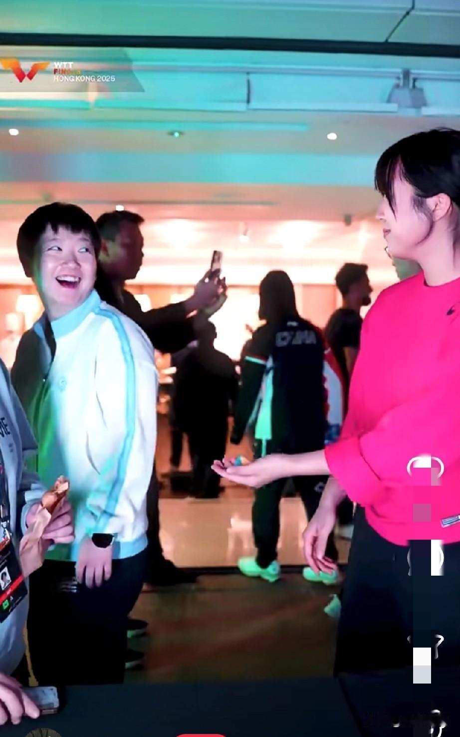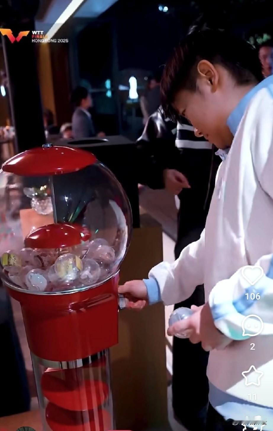 莎莎昨天晚上玩的很开心啊。 刚刚看到WTT发了香港总决赛欢迎晚宴花絮,莎莎在玩抓石子的游戏,她还问申裕斌会不会玩,申裕斌摆摆手说不会,然后莎莎就让申裕斌看她怎么玩儿,后来申裕斌也学着玩了一会儿。莎莎把五颗子都抓在手里后,还开心的举起手来欢呼:“耶”,真的就像小朋友一样,站在旁边的申裕斌给莎莎姐姐鼓掌,刘恒看着莎莎也是一脸宠溺的笑,这个女孩子真的太可爱了。 喜欢莎莎的笑,不管走到哪里,她就是开心果。都抓在手里后,可以去扭蛋机里扭一个小礼物,看莎莎手里已经握着两个了,估计佳佳和朱梓予妹妹手里的球球也都是莎莎赢得。在成都打比赛,她都没时间出去吃好吃的,更没时间玩了,来了香港还有玩的,孩子肯定很开心。 在成都混团比赛的时候,申裕斌因为膝盖有伤没有打后面的比赛,不过香港总决赛她来了,应该是可以打比赛了吧。昨晚休息了一晚上,今天上午莎莎也去上训了,明天莎莎有混双的比赛,加油!