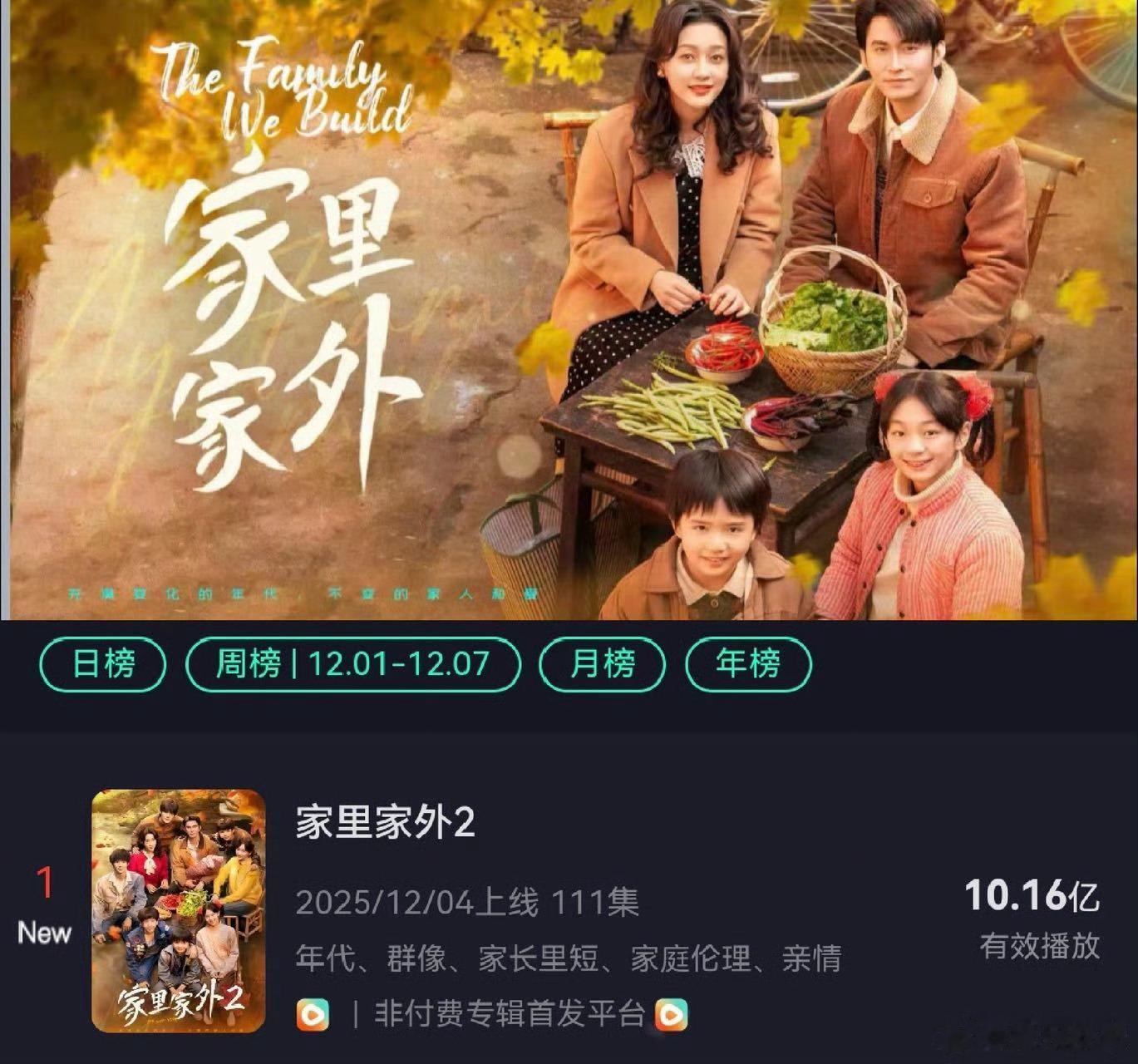 2025年播放量最快破10亿短剧 看一集就上头!家庭故事竟能如此动人幽默与泪点交织,《家里家外2》用温暖征服10亿播放。