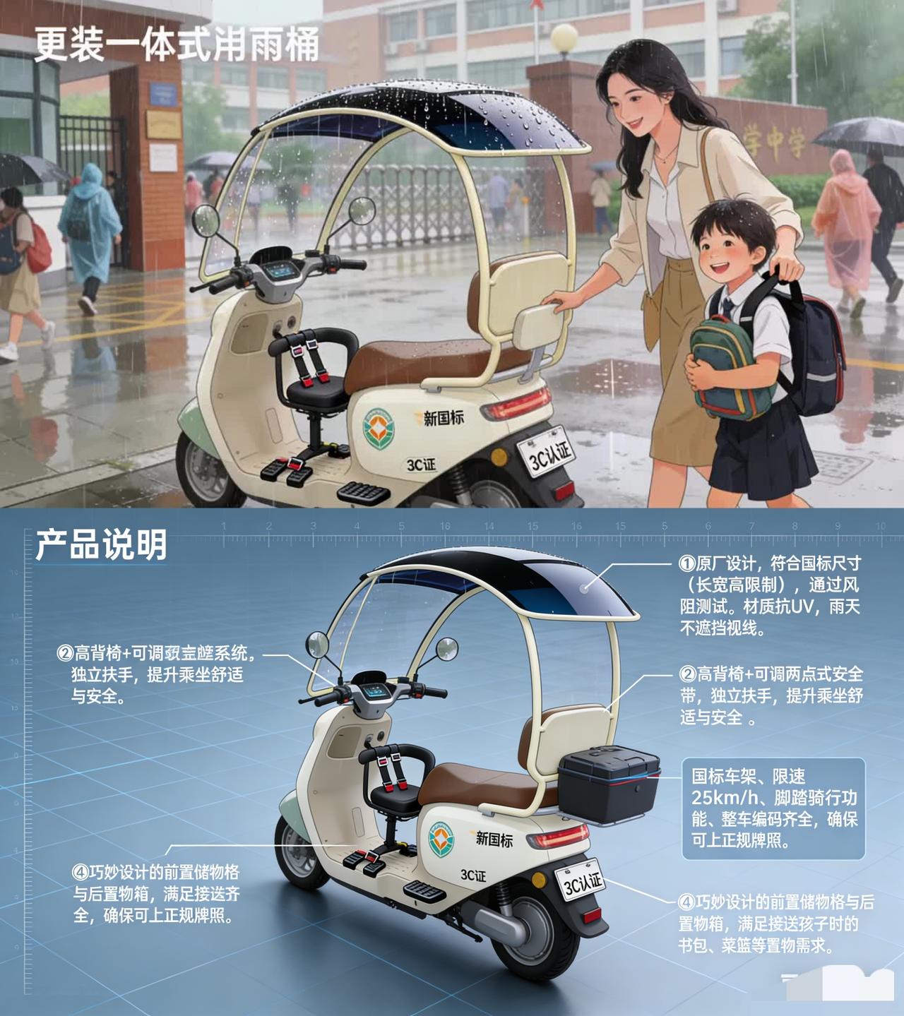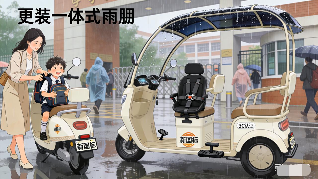 炸锅了,带雨棚、有安全带的电动车来了!网友狂赞:这才是老百姓要的新国标! 你有没有过这种狼狈:接娃放学突降暴雨,手忙脚乱给孩子套雨衣,自己淋成落汤鸡?或者夏天烈日当头,骑车像在“铁板烧”上移动? 别急,一款被称为“接娃神器终极体”的新国标电动车,可能真的要改变游戏规则了! 它火了,就凭两大“狠活”: 首先,“移动阳光房”级雨棚:不是后装的那种危险车篷,而是出厂原装、经过风阻测试的一体化设计。最关键的是,厂家宣称其长宽高完全卡在新国标限值内,成功拿到了“身份证”——合规、能上牌 其次,“保姆级”后排安全带:专门为后座孩子设计,两点式固定,防止小家伙乱动或打瞌睡时跌落。虽然比不上汽车安全级别,但这份心思,让家长安全感陡增。 但这车引发的讨论,远不止“好用”那么简单: 谁在狂喜?除了宝妈宝爸,老年群体和短途通勤的年轻人也直呼“刚需”。这不再是单纯的“接娃车”,而是升级成了 “全场景舒适代步车” 产业暗战打响:这标志着电动车竞争进入了新维度——不再比谁跑得远,而是比谁更懂老百姓下雨天、大热天的痛。行业“内卷”终于卷到了老百姓心坎上。 最大的悬念:它真的能在全国所有城市畅行无阻吗?各地交警对“带棚”的认定尺度不一,仍是它面临的最大现实关卡。这可能是一场 “产品创新”与“地方执法”的赛跑。 评论区已经爆了: 支持派:“这才叫工业设计为人民服务!赶紧量产!” 务实派:“多少钱?续航多少?别是样子货。” 担忧派:“冬天是温室,夏天是蒸笼吧?侧风大了会不会飘?” 那么,你怎么看? 1. 你觉得这种设计是真安全还是新隐患? 2. 如果价格比普通车贵500-1000,你会为这份“舒适与安心”买单吗? 3. 你所在的城市,会允许这样的电动车上路吗? 一款电动车的走红,照出的其实是城市出行“最后一公里”中,每个人对体面、安全与尊严的最朴素渴望。它不仅仅是一辆车,更是一个生活提案,评论区聊聊你的想法电动车合法雨棚