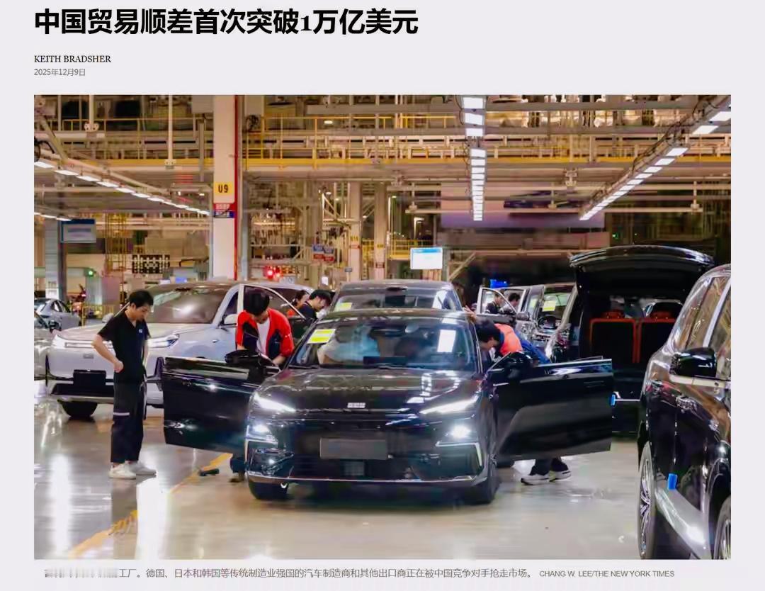今天是的历史性的时刻:中国的贸易顺差,突破了1万亿美元!这是世界历史上绝无仅有的! 根据中国海关总署2025年12月初公布的官方数据,截至2025年11月底,中国货物贸易顺差已达1.08万亿美元,用时仅11个月就突破1万亿美元大关,创造了全球贸易史上的新纪录。 中国取得这样的成绩真的不容易,要知道2025年,世界贸易差一点被特朗普的“对等关税”政策各国搞垮了!我们几乎大半年的时间都是在和美国“对峙”! 欧洲也是依附跟随美国对我们的对外贸易下手。 在这种外部环境极其恶劣的情况下,还能创造出这样的成绩,应该说是“历史的车轮滚滚向前”,任何人都无法阻挡啊! 但是面对这么亮眼的数据,也有人开始担心,这样下去美国和欧洲会“善罢甘休”吗?马克龙刚回国就对中欧的贸易顺差发出了强烈信号,扬言无法忍受!要采取措施! 贸易顺差对我们来说固然是好事,但是这种局面如果长期持续也会有变数! 有专家分析,当下美欧还不好改变现状,因为我们出口的关键引擎是以电动汽车、锂电池、光伏产品为核心的“新三样”!在这些领域,美欧根本没有和我们竞争的条件!他们唯一的方法就是“加关税”!但是这解决不了根本问题! 但是作为我们自己也要有所准备,外贸固然重要,而我们国内的经济循环,由于失去了房地产的这个重要引擎,老百姓今年在就业方面也是有压力的! 所以,激活国内经济循环,应该是明年我们努力的方向,大家对此有何看法? 声明:个人观点,仅供参考!